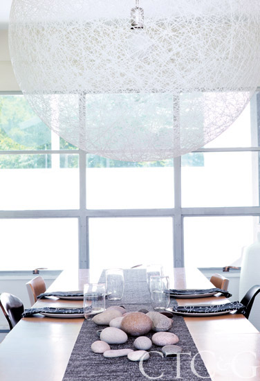 A massive Mooi fixture—called Random Light—from Hive Modern echoes a collection of rocks on the sleekly polished dining room table. Napkins are from See Design.