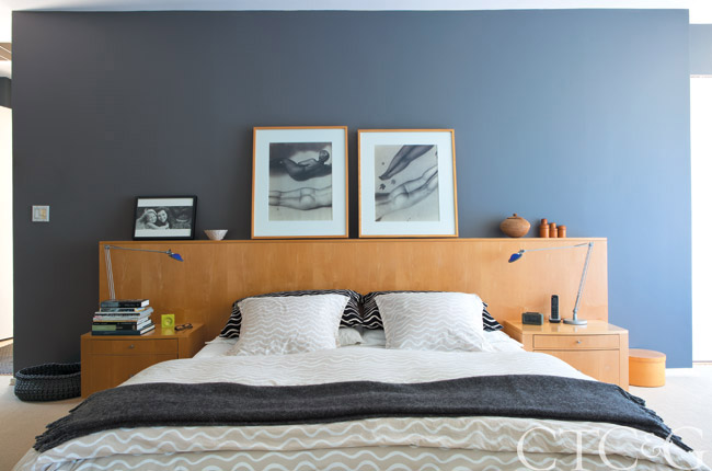 In the master bedroom, a duvet made of a See Design called Wave Straw and pillows in Wave bring life to a boxy bed.
