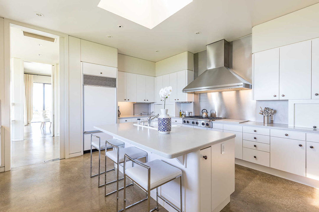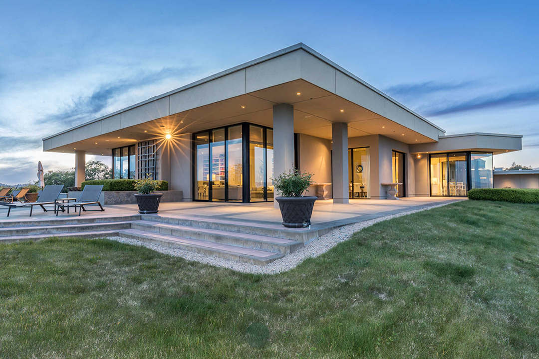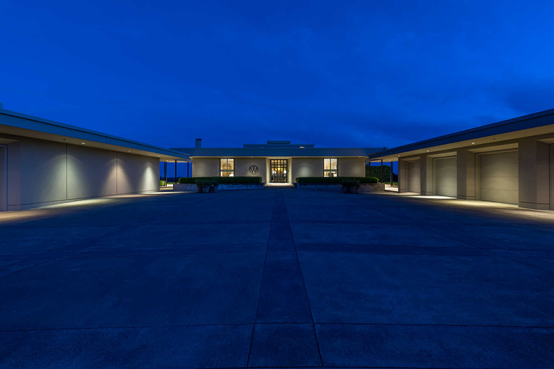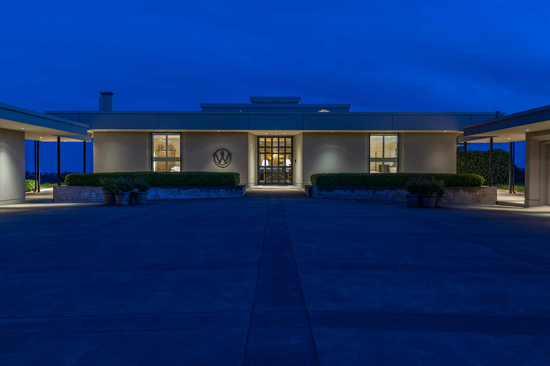 Set on 61 acres, including approximately 25 of organic Pinot Noir and Chardonnay vineyards, lies a home that is both strikingly luxe and at peace with the lush surroundings. Giving the estate a juxtaposition that sets it apart from others in the area, the minimalist abode’s clean lines and concrete surfaces are complemented by the landscape that lies in the background.