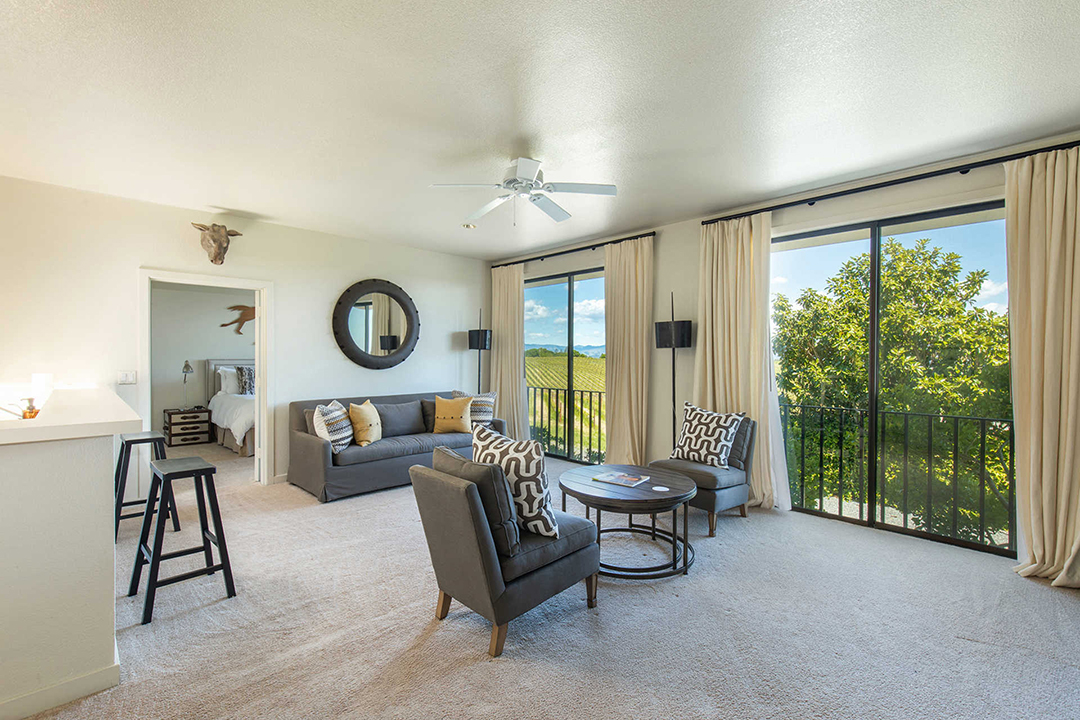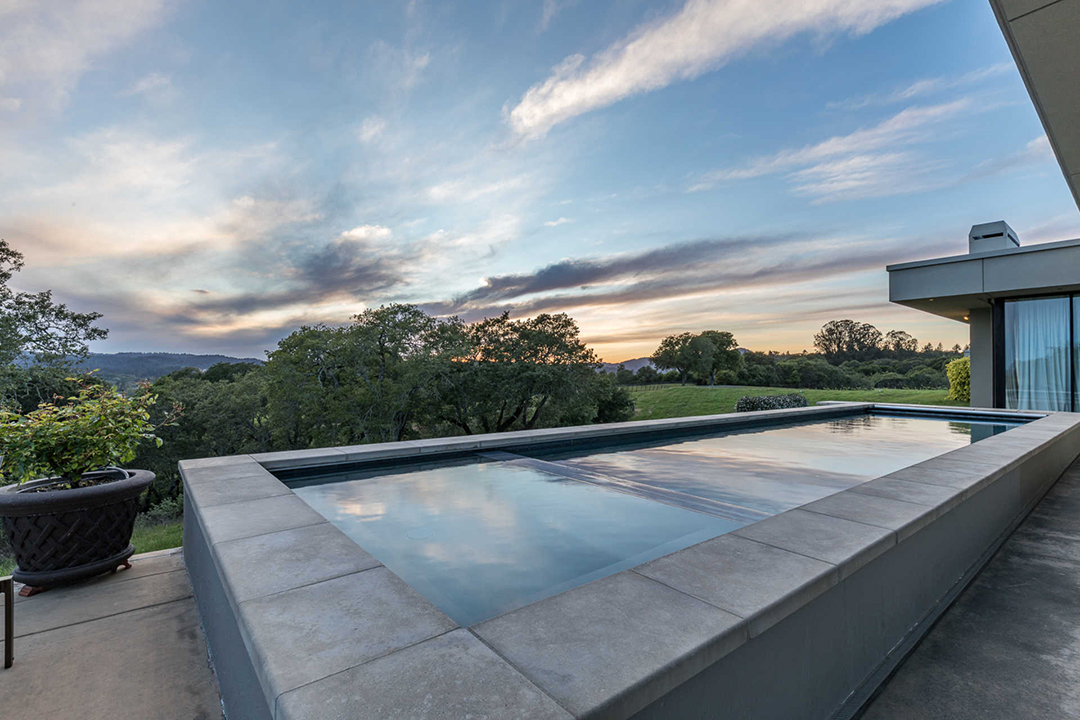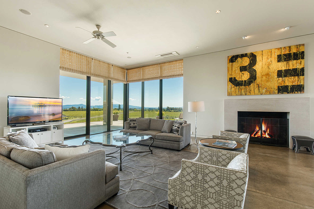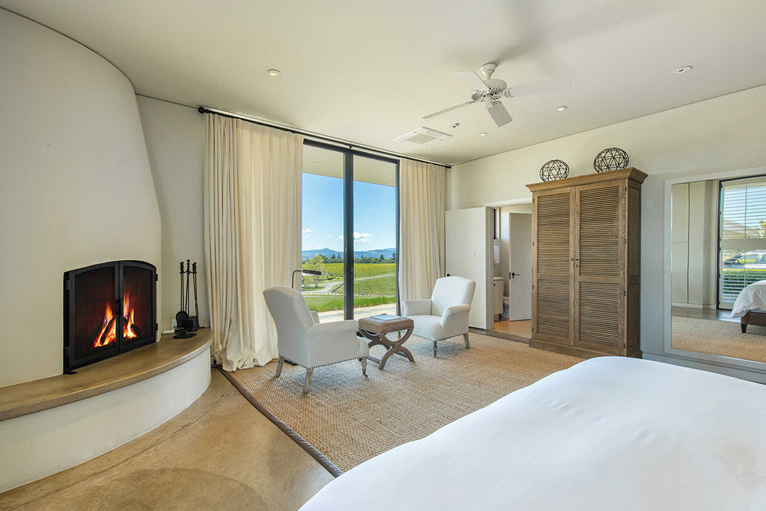 The main house and convenient guesthouse share a dramatic courtyard far more stark than the romantic atmosphere vineyards typically bring to mind. Suave and the epitome of modern style, all the outdoor spaces take a no-frills approach and let the views shine. Out back, a pool framed in rugged stone and plenty of patio space guarantees a new owner the ultimate California lifestyle.