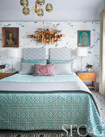 Across the hall in the master bedroom, midcentury nightstands flank a bed with a headboard the homeowners constructed by repurposing a wooden desk. Two vintage portraits and a metal sculpture that channels Curtis Jeré are mounted on a wall covered in Trove’s Ahza print. “I love the movement,” says Hohla of the paper’s multitude of fluttering moths. “It’s elegant but also kind of trippy.”