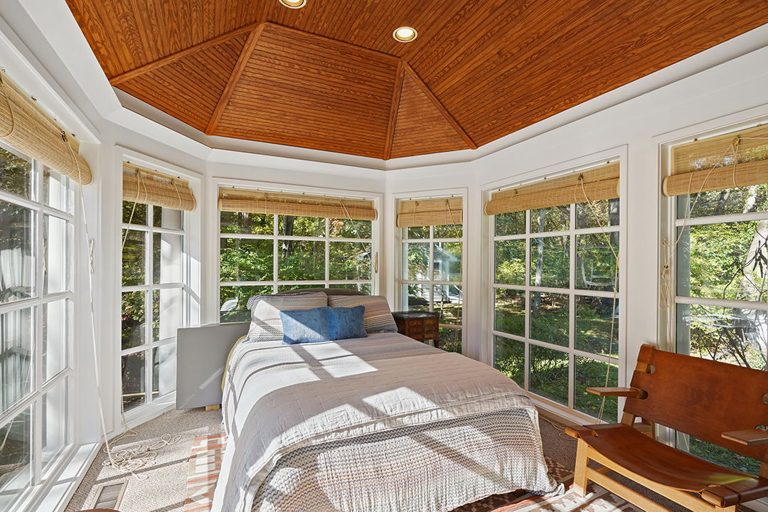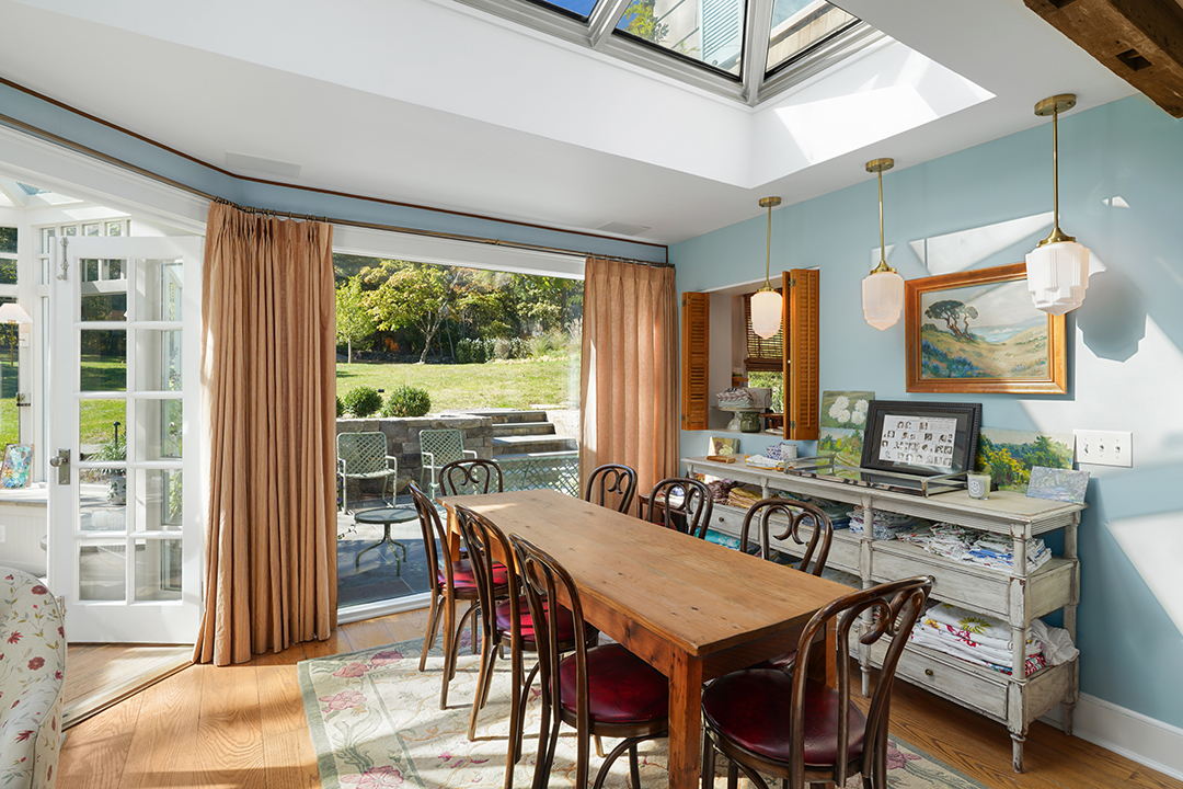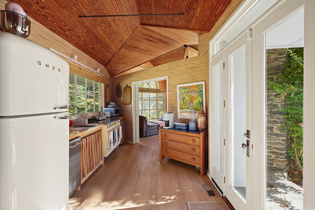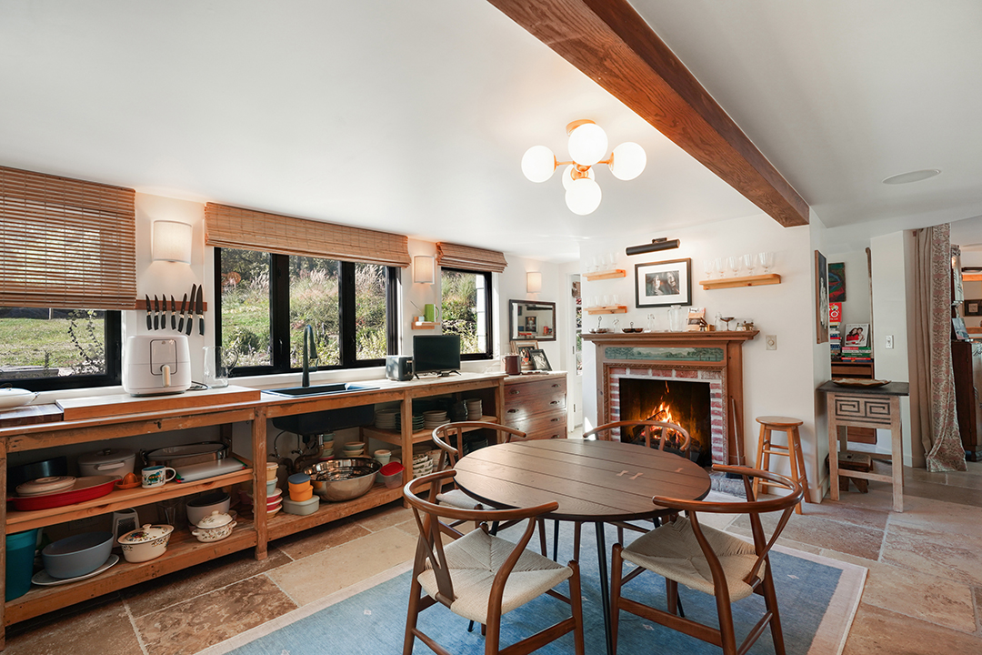 The main house boasts four bedrooms, including the vast primary suite with its own balcony. The pool house is a dream hideaway for guests, or perhaps to use for multi-generational living. It’s offers a living room, eye-catching kitchen, bedroom, and bathroom with a soaking tub overlooking the bucolic grounds. The estate’s final bedroom is in the cottage, lofted above yet another kitchen.