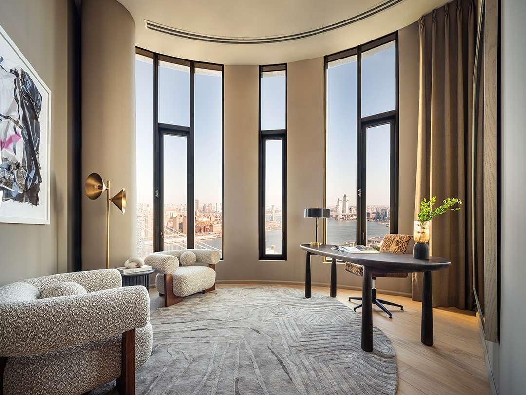 “As you walk through the front door, soaring ceilings allow natural light to flood in from three exposures,” shares listing agent Jessica Peters. “Every room offers its own breathtaking vantage point, with the living area as the most striking of all—the city skyline’s reflection in the river by day transforms into softly shimmering lights by night.”