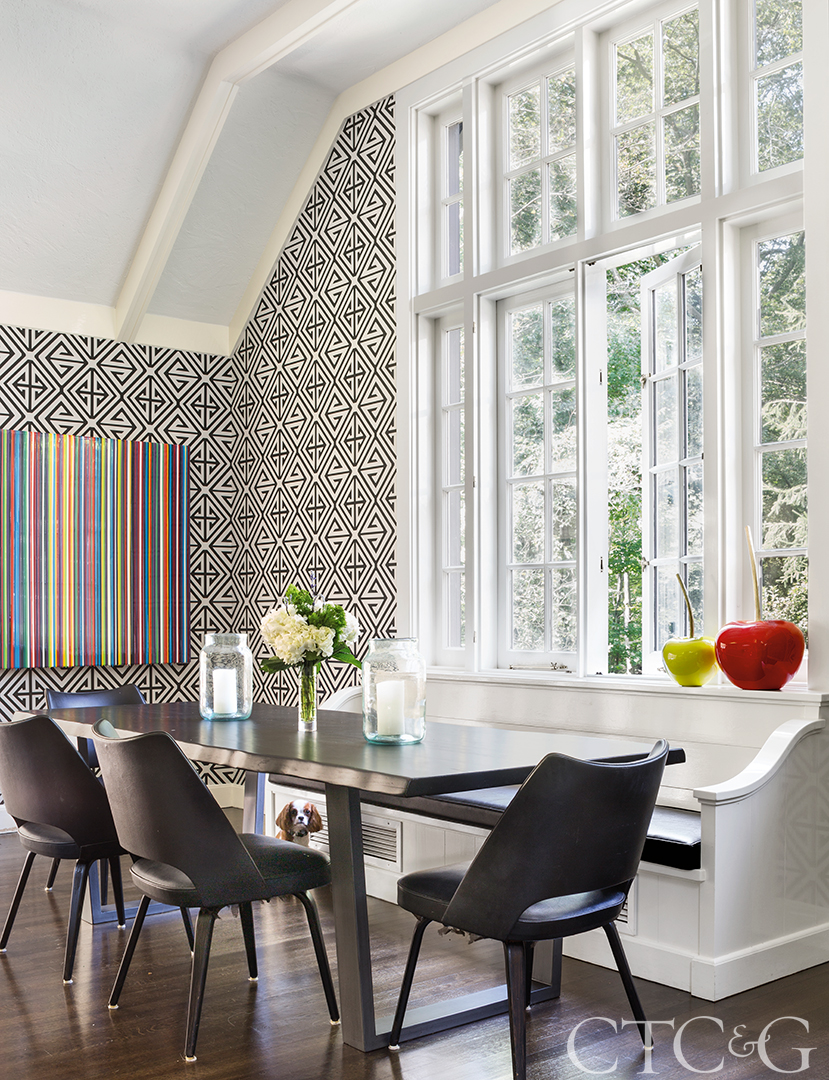 Demetrius wallpaper from Thibaut’s Bridgehampton Collection makes a bold statement in the kitchen eating area. Vintage Thonet dining chairs from 1st Dibs provide casual seating, while a work by Gian Garofalo from Samuel Owen and giant cherry sculptures from Arteriors add pops of color.
