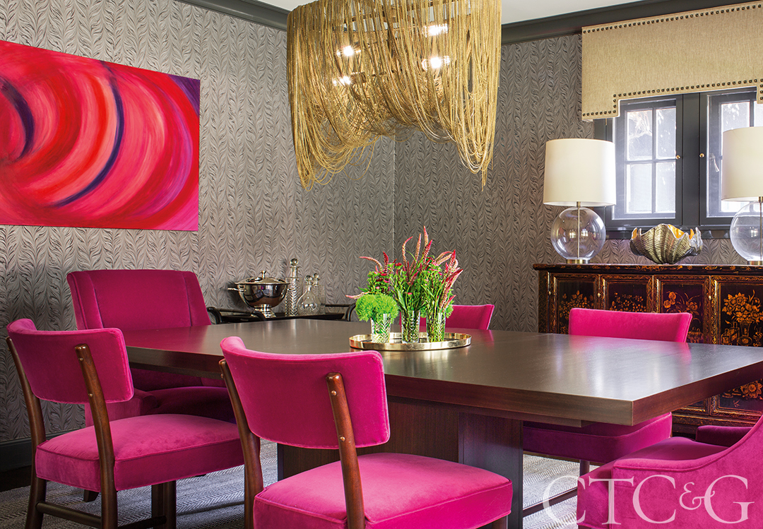 The formal dining room’s wallpaper and antique Chinese sideboard is offset by 1950s dining chairs from The Local Vault that Handler reupholstered in magenta velvet and Kelly Lynn Kimball’s Life Unfinished from Saatchi Art. An Arteriors chandelier is made of adjustable chains.