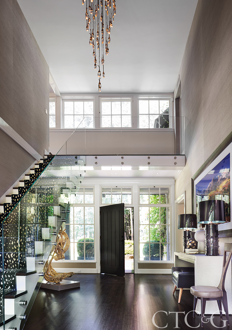 Handler replaced the traditional banister with glass to open up the home’s entry and added a Blue Antelope runner by Prestige Mills from Carpet Trends. Lamps from Juliska sit atop a concrete-top entry table alongside a lit sculpture from Cocoon, with a photo of Vail, Colorado, by John Richter above. Ochre’s Pebble chandelier draws the eye upward.