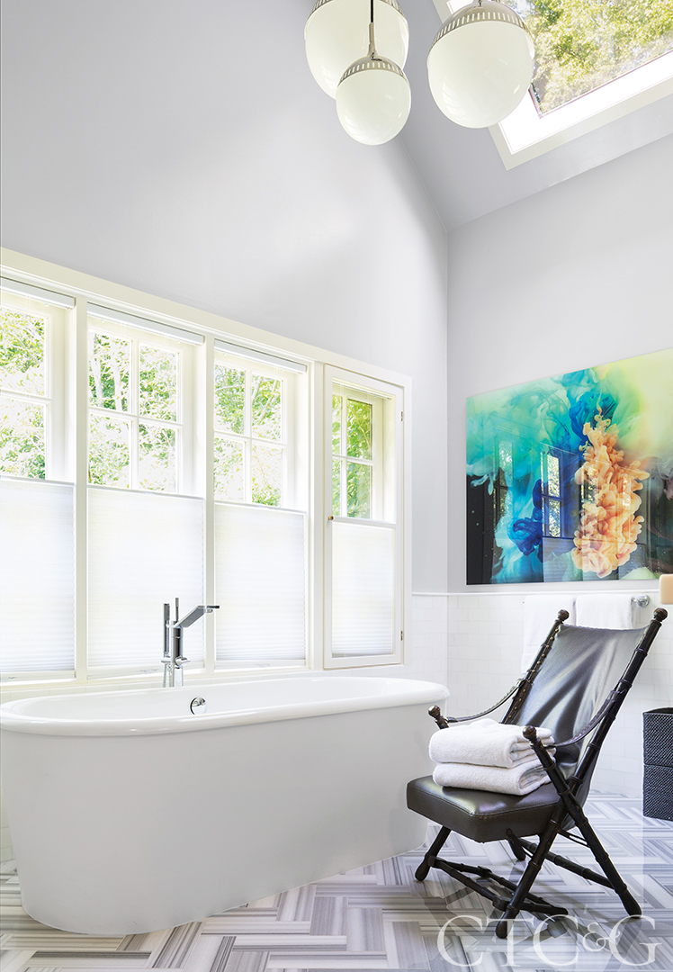 A Waterworks Colette soaking tub has pride of place in the master bathroom. Jonathan Adler’s Rio chandelier illuminates the high ceiling, while Javiera Estrada’s photograph Reverie #4 from Saatchi Art adds color.