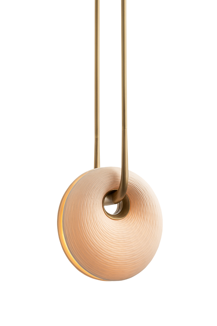 The brass and porcelain Torus Pendant draws inspiration from the sea, its flawless form like a seashell shaped by the natural ebb and flow of water.