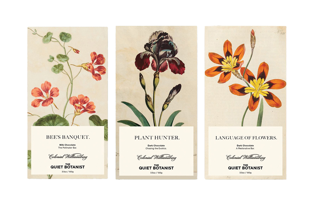 The new chocolate bar collection from The Quiet Botanist x Williamsburg features art from the Colonial Williamsburg Foundation’s rare book archives.