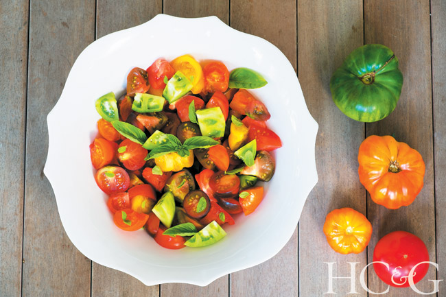 Mix first four ingredients together and let sit at room temperature for a bit to absorb flavors before serving, garnished with the basil. Tip: Soaking the red onion in ice water for 15 minutes after slicing softens its pungency and lets the tomatoes take center stage. Recipe from the kitchen of Carron Sherry and Rich Hogan.