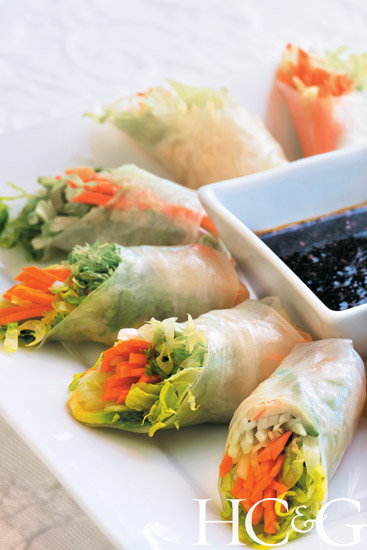 For the dipping sauce: 3 T rice wine vinegar ¼ c. low-sodium soy sauce 1 T black sesame seeds 1 tsp. toasted sesame oil 1 tsp. organic raw blue agave For the summer vegetable rolls: 12 sheets rice paper 2 large carrots, peeled and julienned 1 head romaine lettuce, shredded 1 large cucumber, peeled, seeded, and julienned 1 large avocado, pitted, peeled, and thinly sliced To make the dipping sauce, combine all ingredients in a mixing bowl and chill until ready to serve; you should have about a ½ cup. To make the summer vegetable rolls, dip a sheet of rice paper in a bowl filled with warm water and place on a flat work surface. (If you like, use a little nonstick cooking spray on the work surface to make assembly easier.) Lay a small amount of carrots, lettuce, cucumber, and avocado on the lower third of the rice paper, about ½’ from the bottom and sides, and roll tightly. The rice paper will stick to itself, creating a seal. Repeat with the remaining rice paper sheets and filling. Slice the vegetable rolls in half on the diagonal and serve with dipping sauce. Recipe from the kitchen of Kara and Steve Ross.