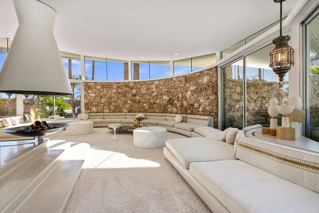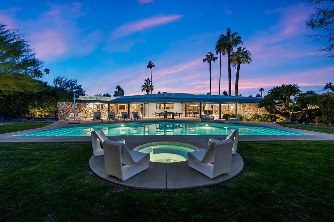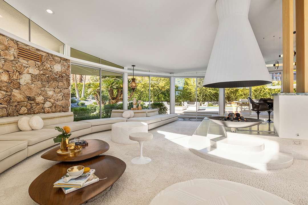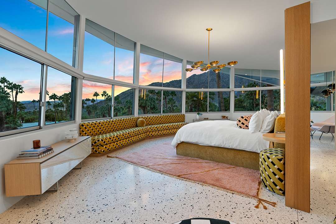 Known as “Honeymoon House,” “The Alexander Residence,” and “The House Of Tomorrow” per a 1962 magazine feature, the spaceship-esque home was originally commissioned by developer Robert Helene Alexander to be his personal residence. Architect William Krisel designed it, creating groovy spherical spaces that cement its place in time and modernism. The circular living room is the unequivocal heart of the home. Exploring on, the dreamy primary suite where Elvis slumbered, fabulous curving kitchen, and relaxing backyard with a large pool and mountain views are other defining aspects.