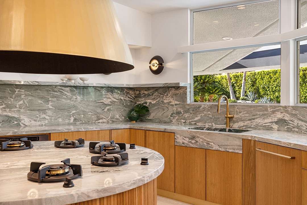 It had received major updates in 2021, but the couple enhanced the one-of-a-kind abode further with the help of Michelle Boudreau Design. The firm’s Instagram page details many of their decor and material decisions. In a post about the kitchen, the design firm shares, “We meticulously maintained the original layout while incorporating custom white oak cabinetry, a rejuvenated circular island cooktop, and a conical hood adorned with natural stone and artisan brass patina. Our goal was to be deliberate in what we preserved and imaginative in how we revitalized it.”