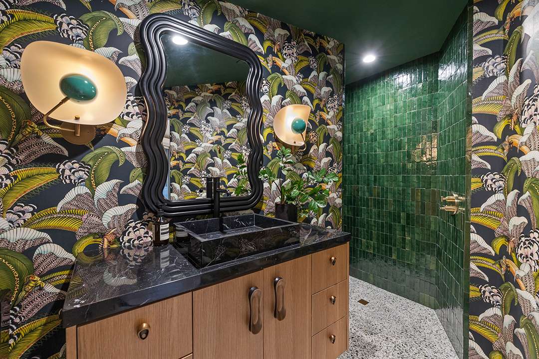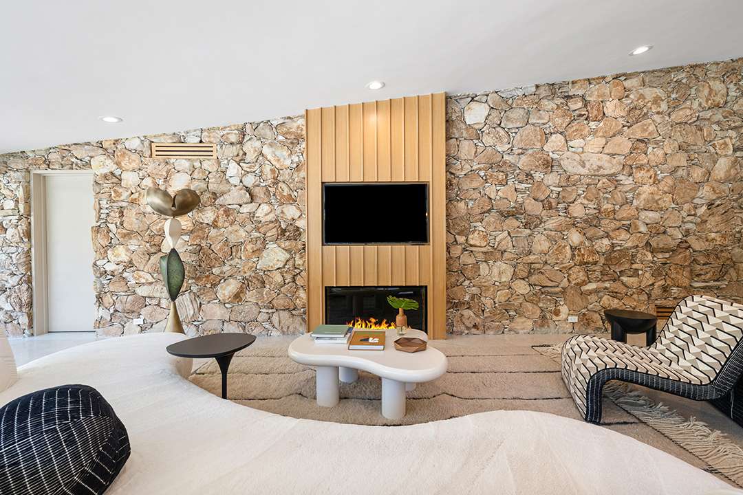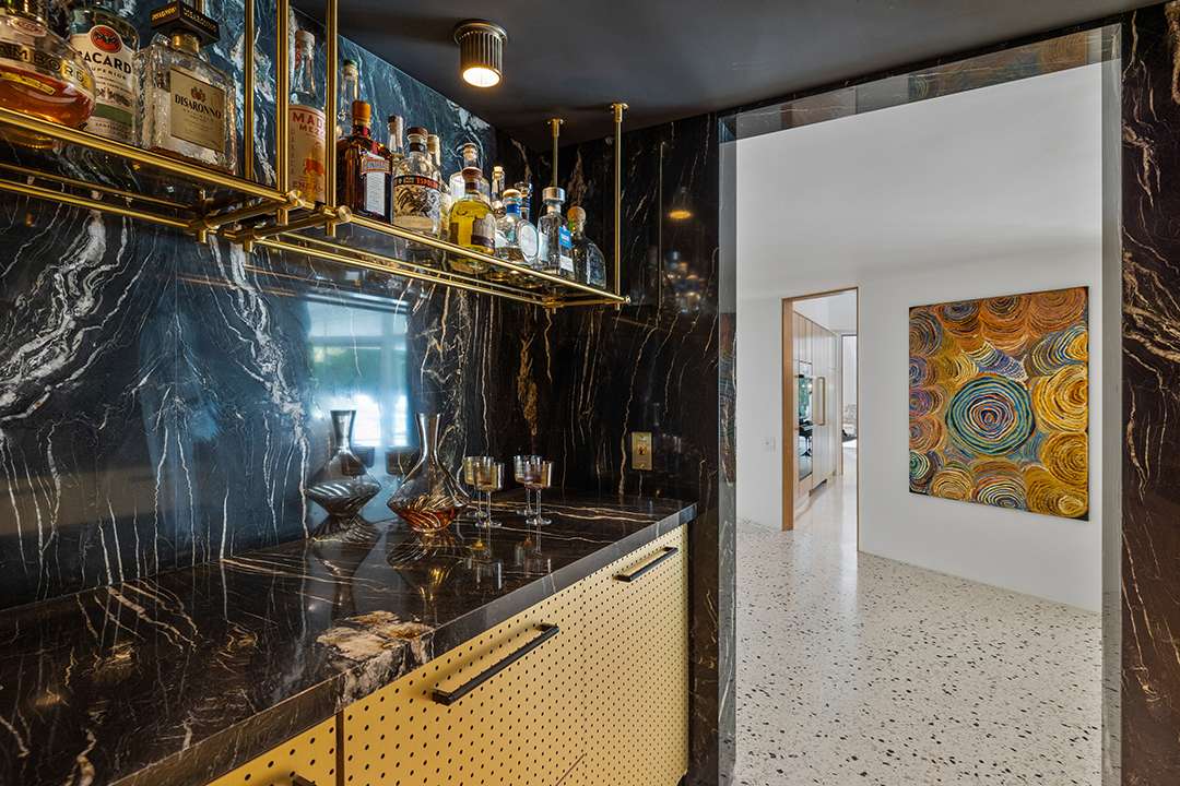 Each room was given attention with a creative yet well-edited eye. The living room’s original rock wall was restored, with matching ivory shag carpeting added to match the custom 40-foot sectional already in place. Elsewhere, it seems one of the biggest changes was a simple walk-in closet transformed into a sultry, black and gold bar inspired by Elvis and Priscilla’s fashionable edge.
