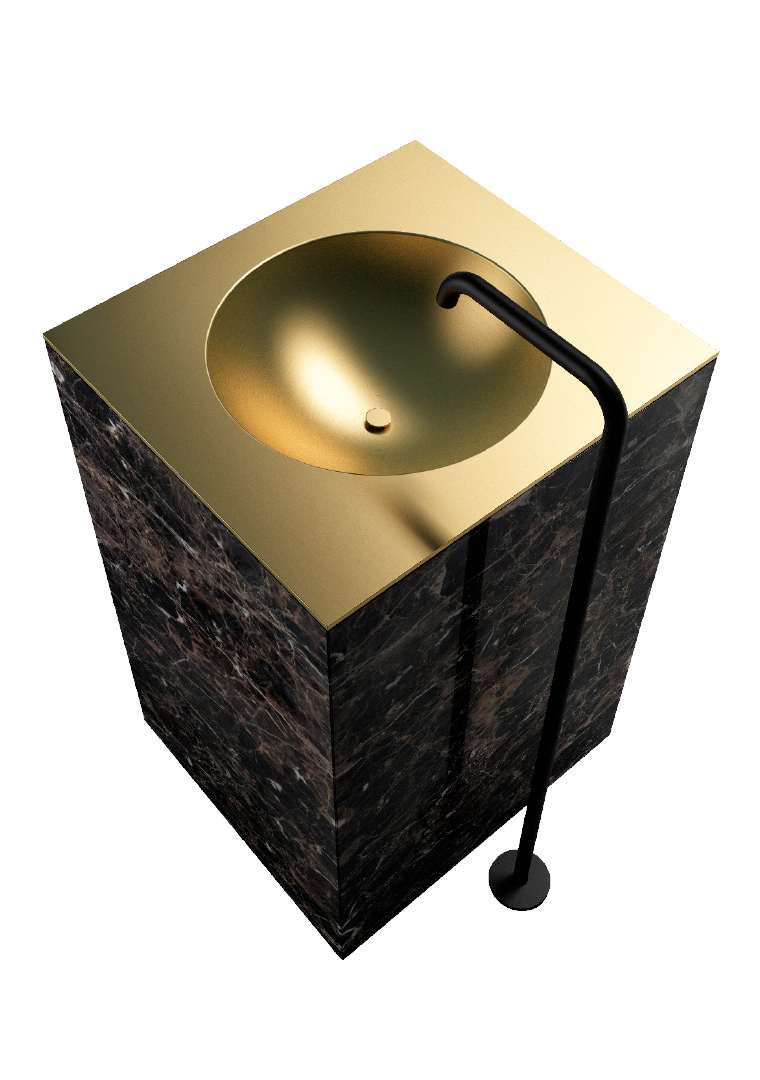 The monolith Code washbasin designed by Piero Lissoni for Boffi is a sculptural addition to a powder or bathroom in Onyx or Emperador marble with a brushed-brass integrated basin. NYC.