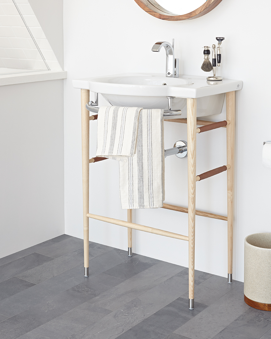 Artful lines and natural materials distinguish the DXV Lowell console sink. Slender, tapered wood legs in a light ash are accented with textured leather. NYC.