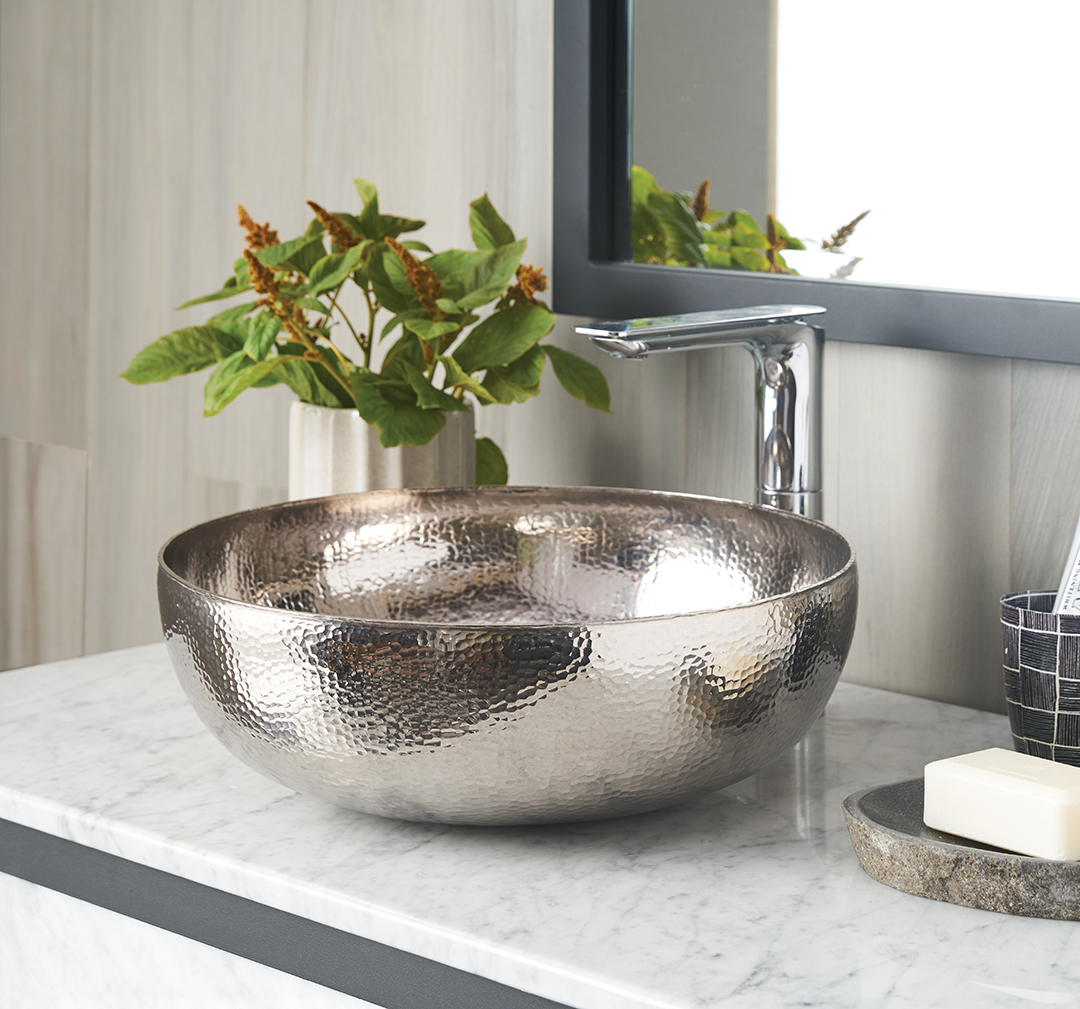 Beauty and practicality merge in the hand-hammered Maestro vessel sink from Native Trails in a warm-toned polished nickel. Through Klaffs, Norwalk.