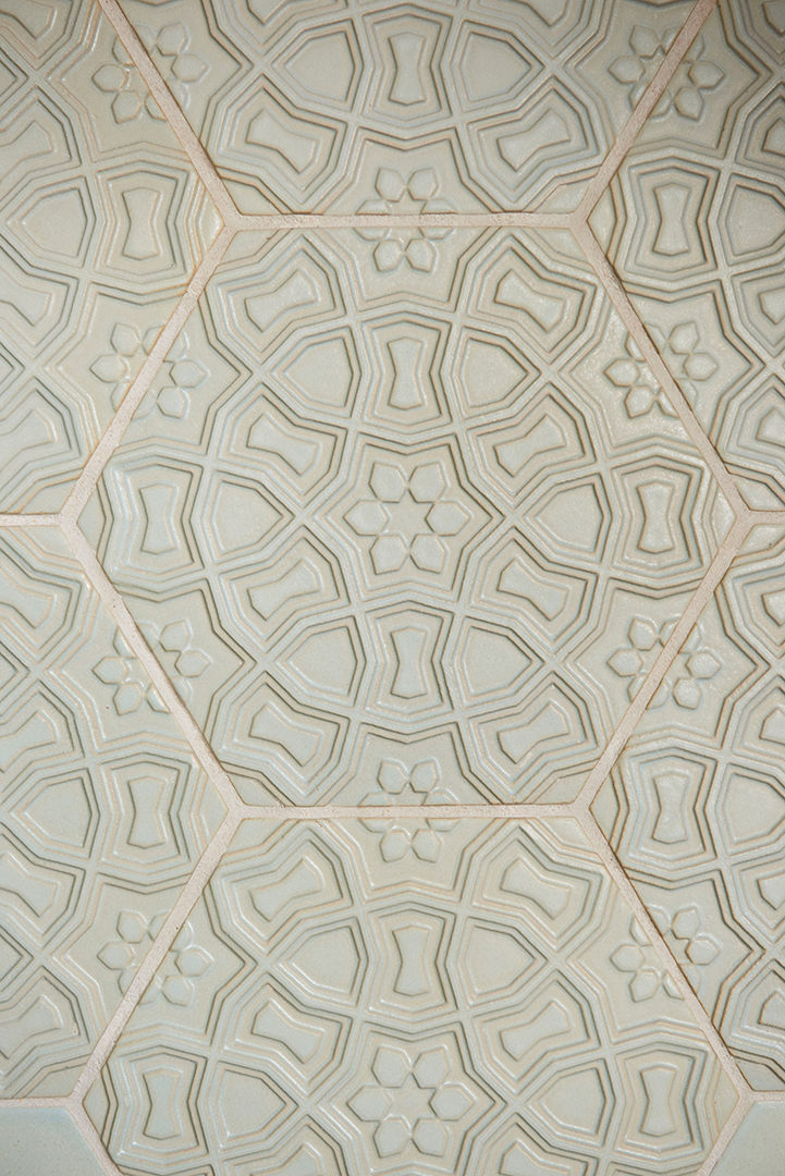 A Moorish pattern in deep relief is hand-pressed in the Walker Zanger Andalucia tiles. The layered geometric shapes are accentuated by a delicately applied glaze. Port Chester, NY.