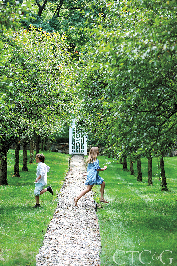 Buchanan’s children romp through an allée of cherry trees that lead to a white gate that opens to a wetlands area dubbed “the secret garden.”