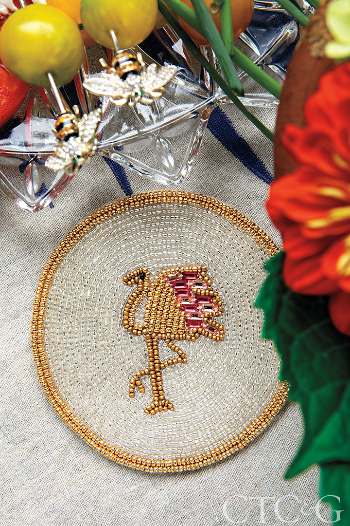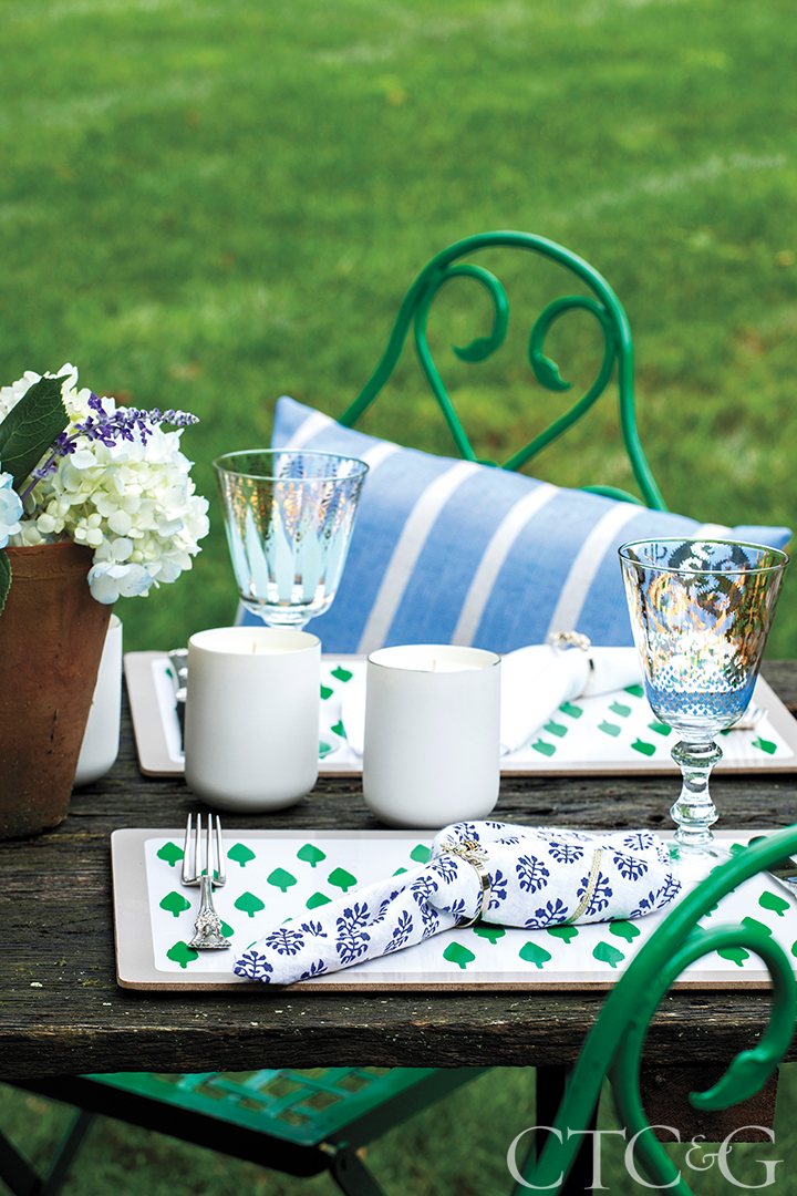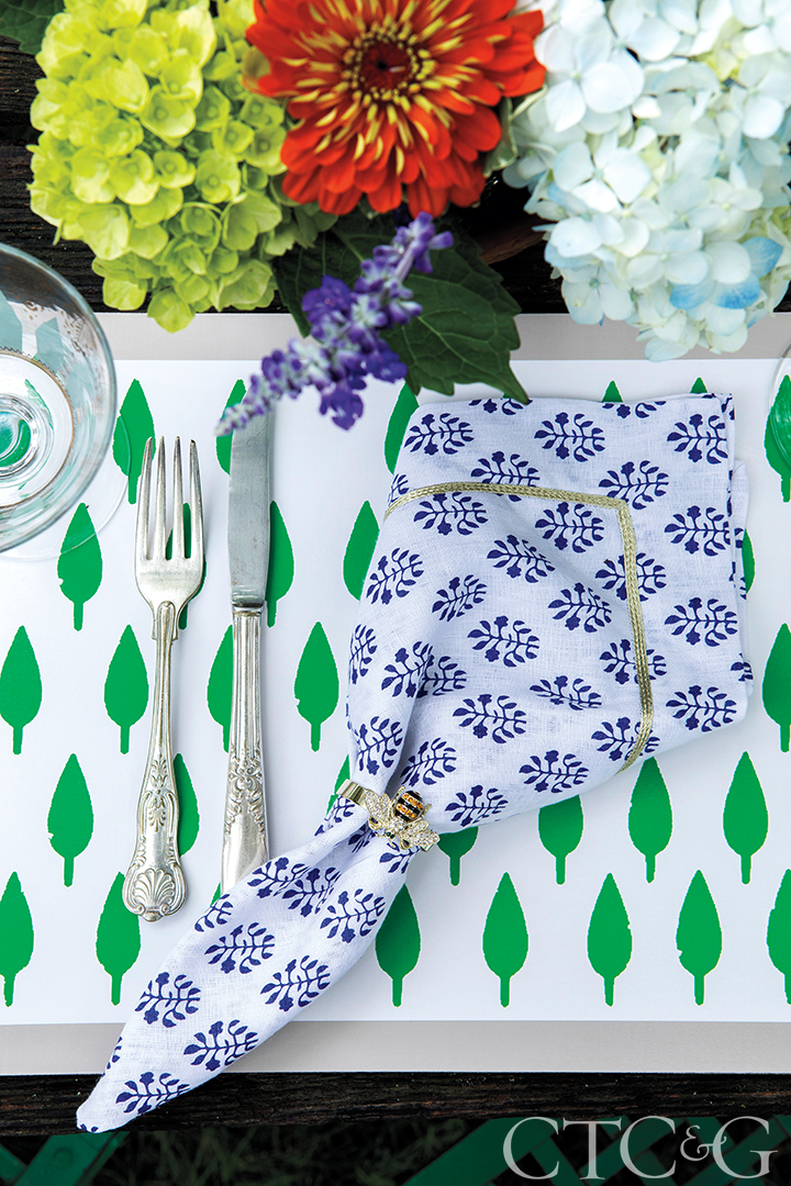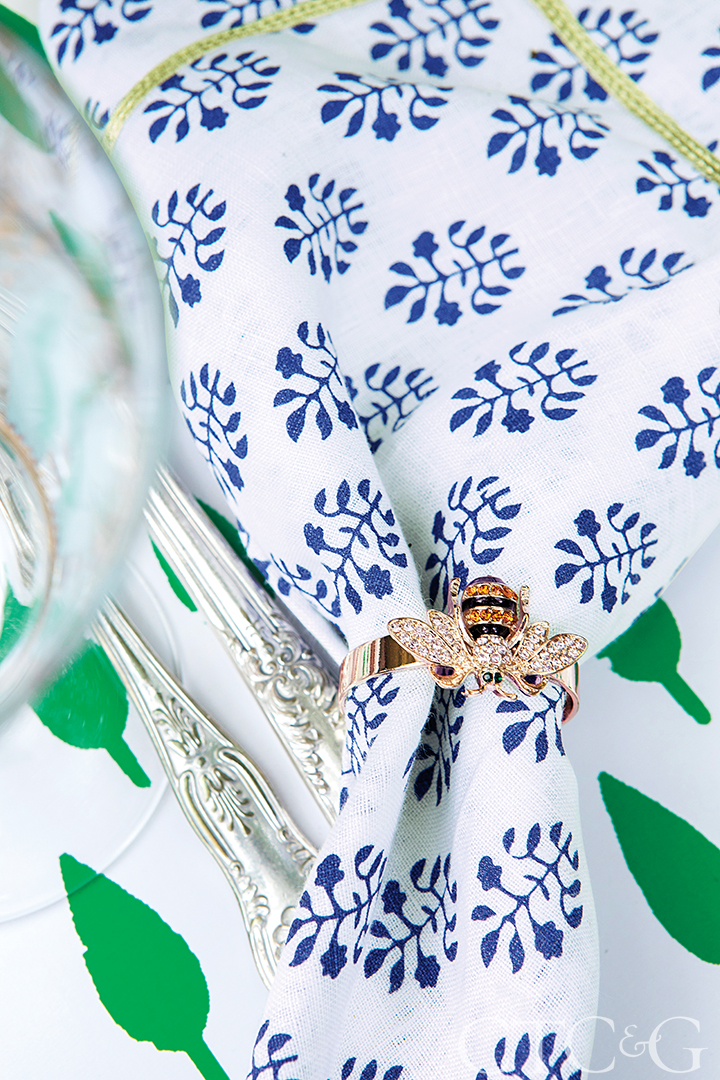 Blue-leaf print napkins from Buchanan’s home collection are finished with her Skinny Stripey Bee napkin ring atop green-tree placemats.