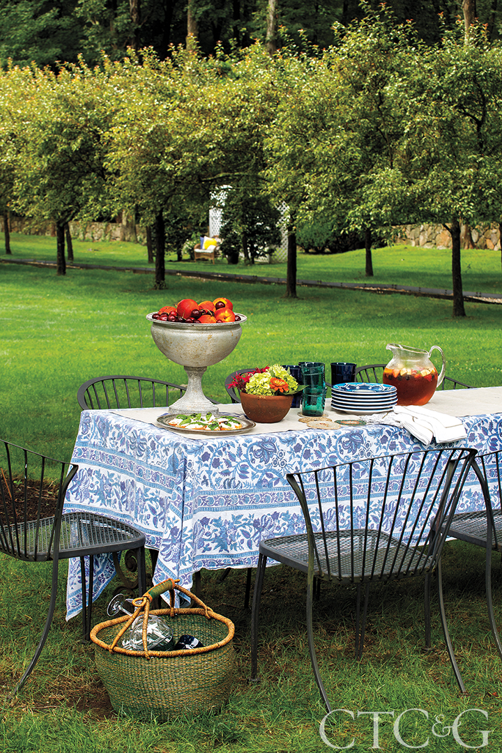 An urn from Terrain holds a bounty of fresh fruit on a table topped with a tablecloth purchased during a trip to India and a tablerunner from Buchanan’s home collection. Melamine plates are from Williams-Sonoma. For easy entertaining, Buchanan stores outdoor-use stemware, cutlery and plates in ready-to-go baskets and jars.