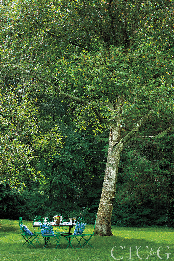 Buchanan creates many different areas for guests to relax and unwind. Dinner may take place under the trees, and then dessert and coffee are served elsewhere.