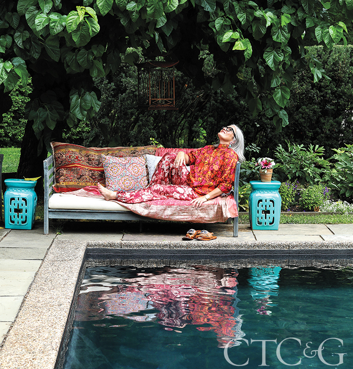 The house and garden are also incubators and testing grounds for her product designs. Coasters, cocktail picks and napkins, bottle openers and wine charms feature honeybees, ladybugs and koi. Coral, evil-eye charms and fanciful jewels adorn items in her collection. “My designs are influenced by my travels,” she notes. “Colors and patterns have to speak to you, and you build on what you love.”