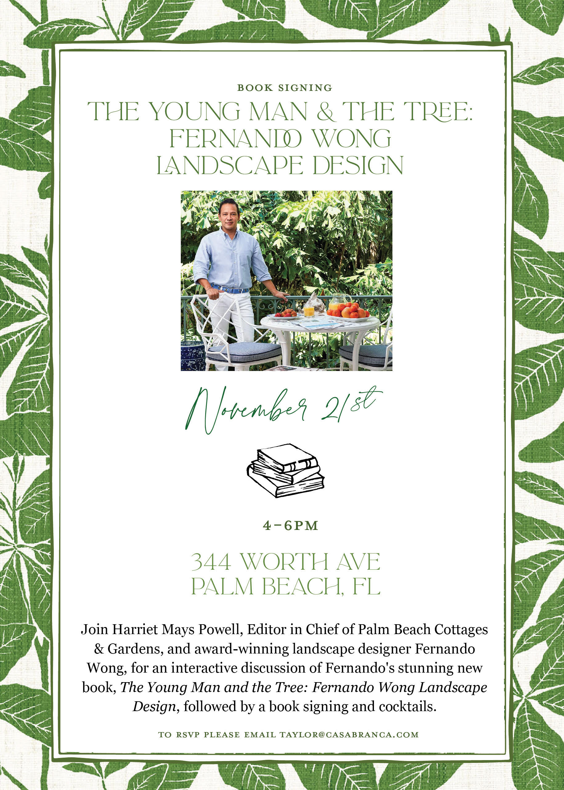 Join Harriet Mays Powell, Editor in Chief of Palm Beach Cottages & Gardens, and award-winning landscape designer Fernando Wong, for an interactive discussion of Fernando's stunning new book, The Young Man and the Tree: Fernando Wong Landscape Design, followed by a book signing and cocktails.