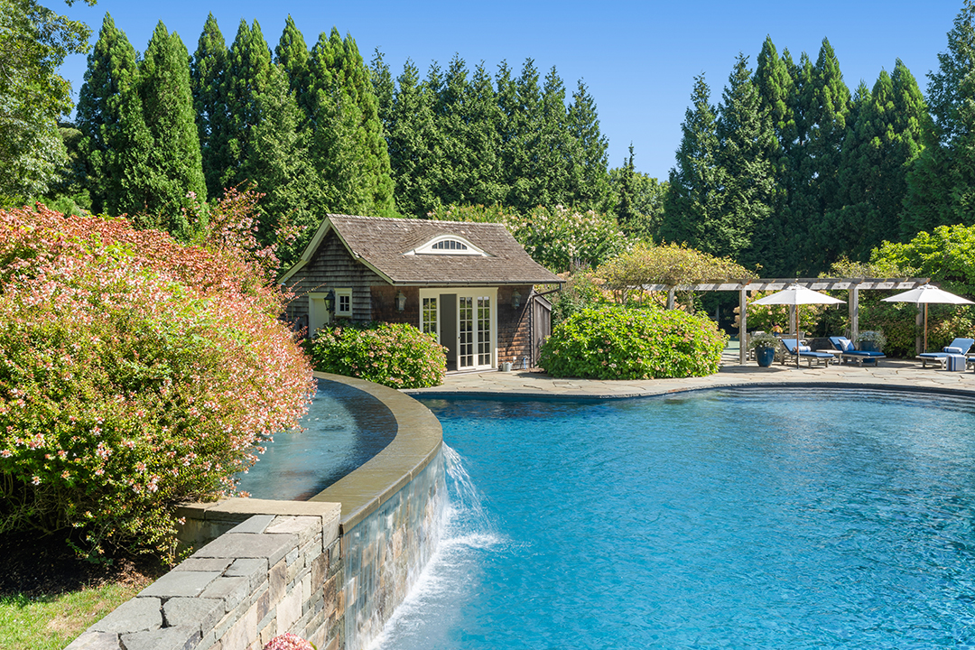 The 7,280-square-foot main house has a classic shingle-style exterior, neutral coastal palette, and seamless indoor-outdoor flow. With six bedrooms and five bathrooms, the interiors feel grand yet airy and polished. Expect to find multiple fireplaces, soaring ceilings, a formal dining room, a library, a family room, a screened-in porch, and more. Of course, what truly stands out for summertime is the verdant outdoor setting. A heated gunite pool with a waterfall, sunken tennis court, pergola-covered patio, multiple terraces, a pool house, and plenty of hydrangeas set the scene for upscale entertaining and full-time leisure.