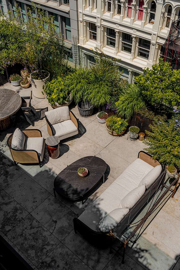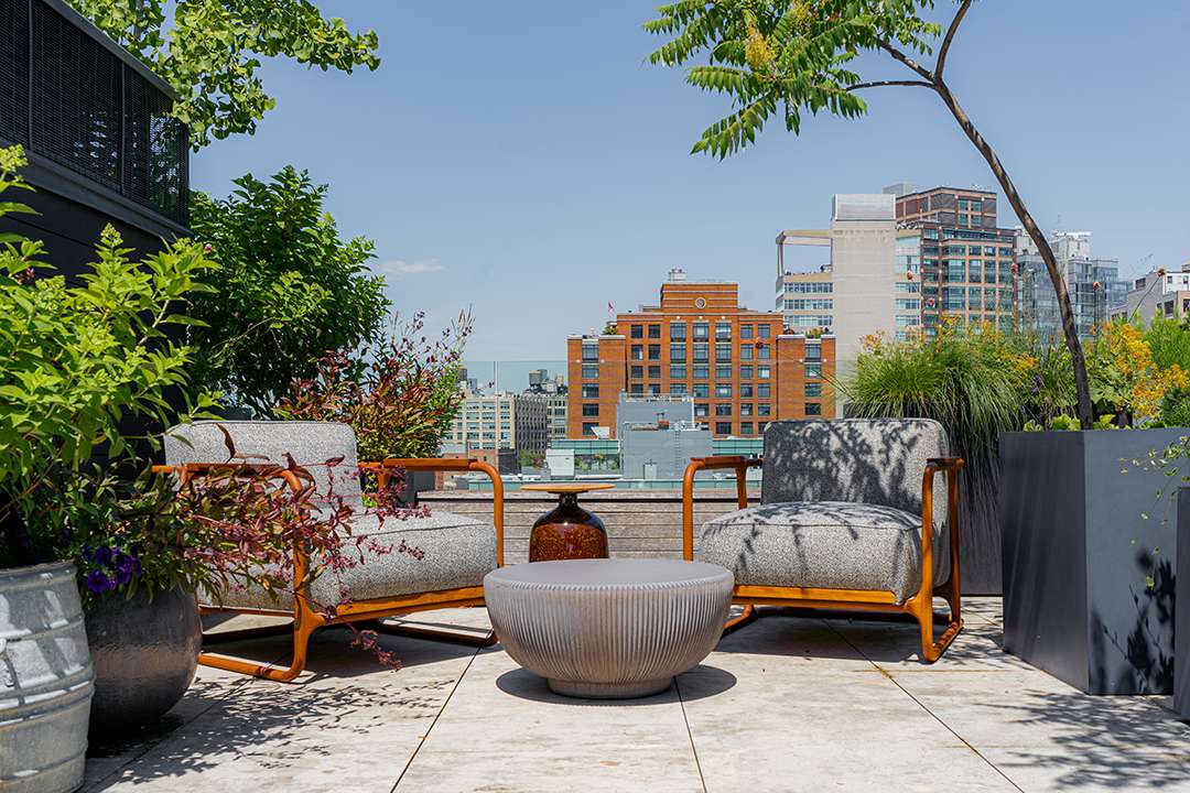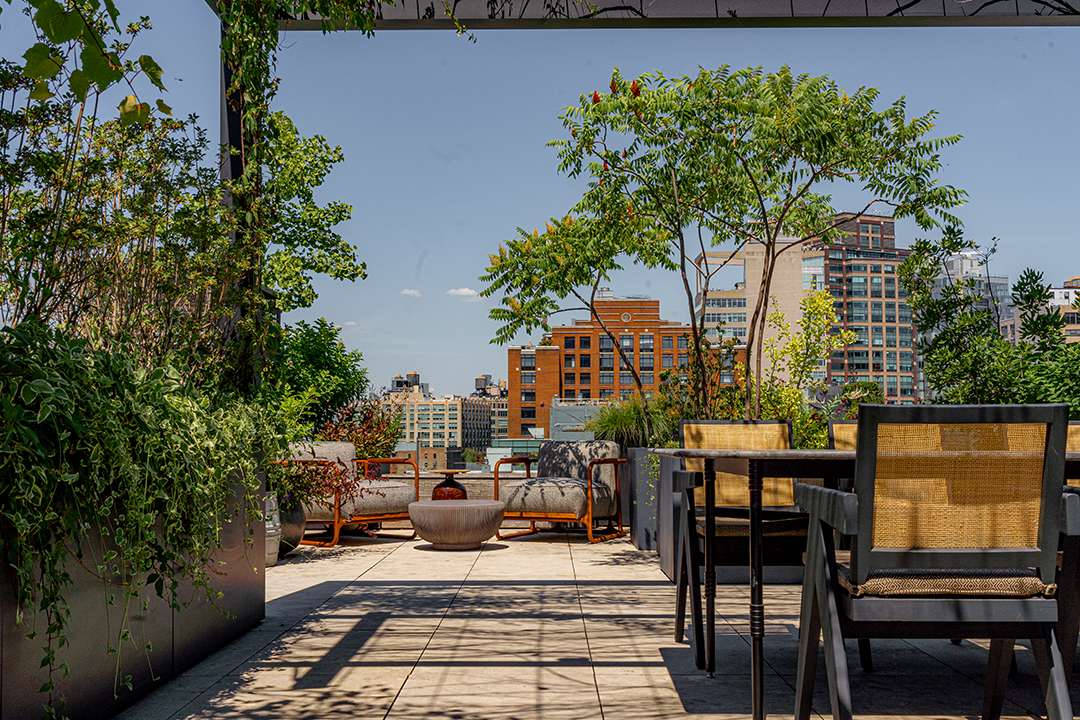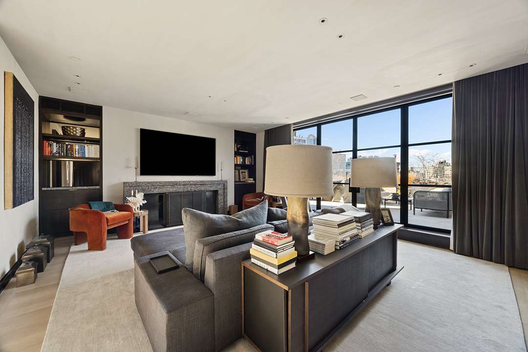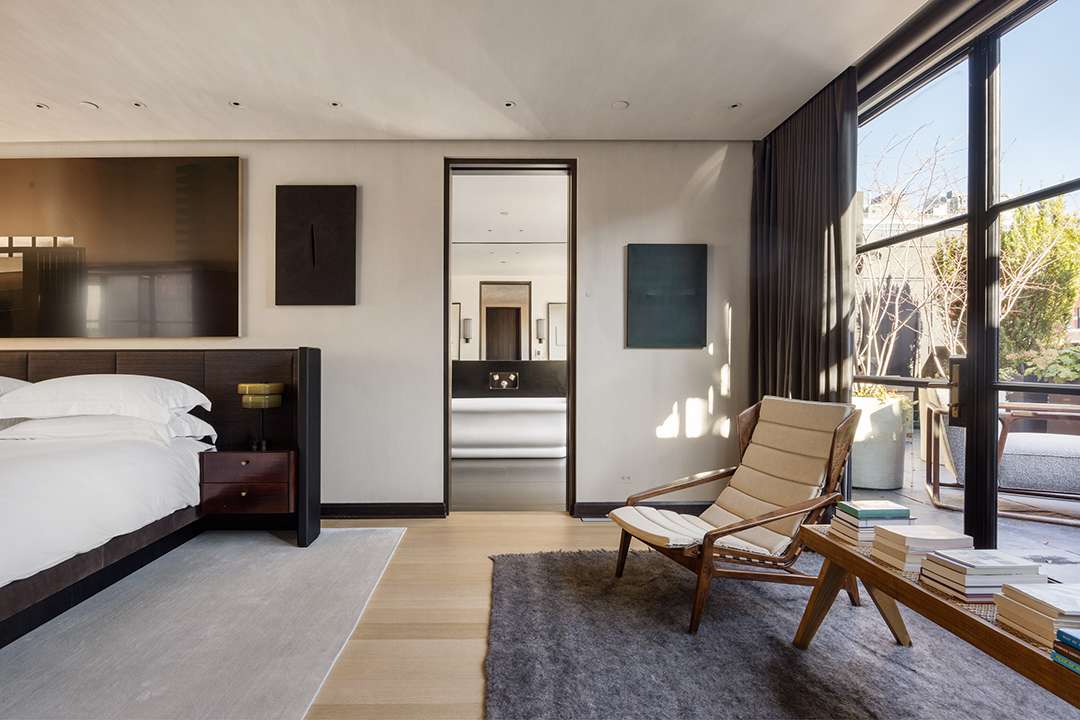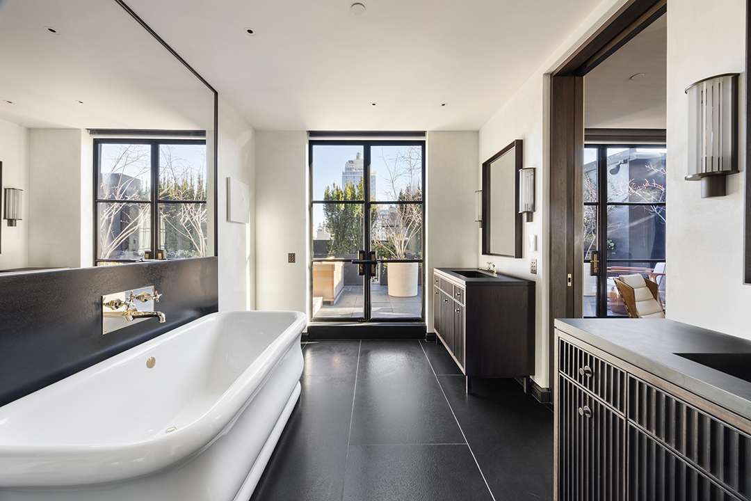 The gourmet kitchen especially dazzles within the 6,800-square-foot penthouse, lined with polished cabinetry, centered by a patinaed metal island, and open to a tailored yet groovy breakfast nook. Just steps away, the home’s massive living and dining area spans over half the level, making this the clear heart of the home for everyday living and special hosting. When the temperatures allow, the rooftop terrace level is another ideal spot for parties with the city lights sparkling around you. There’s 2,841 square feet of private outdoor space in total, including a custom sauna for sweating out stress and a full outdoor kitchen.