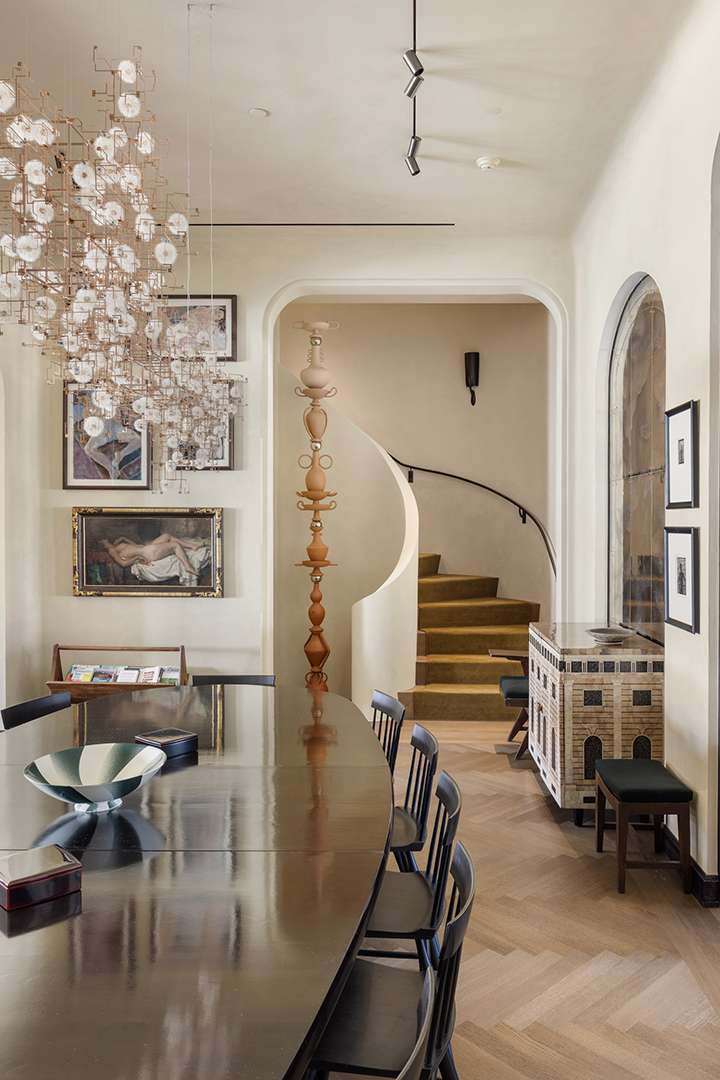 The penthouse has been renovated by two top designers to get to what you see today. It was originally designed by Gachot Studios, who gave the unit new life. Designer Axel Vervoordt later reimagined it further. A timeless palette adorns the spaces, with sleek black accents and beautiful light fixtures bouncing off the light wood floors and ivory walls.