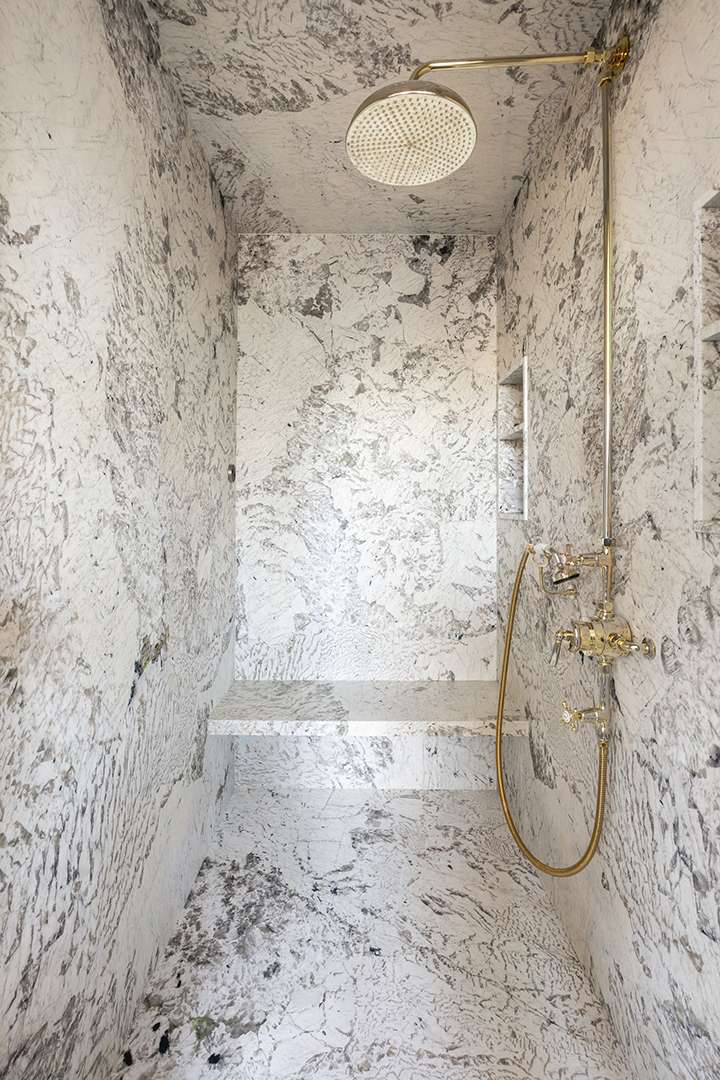 It wouldn’t be a luxury penthouse if the primary suite didn’t deliver the royal treatment. It unfolds over an entire floor, flanked by two terraces on either side. It boasts a dressing room, media room, and walk-in closet, as well as an ensuite outfitted in Barber Wilsons fixtures and a ThermaSol steam shower. The lowest level holds the additional two bedrooms, and could even serve as a guest unit since it has a kitchen and elegant library lounge, too.