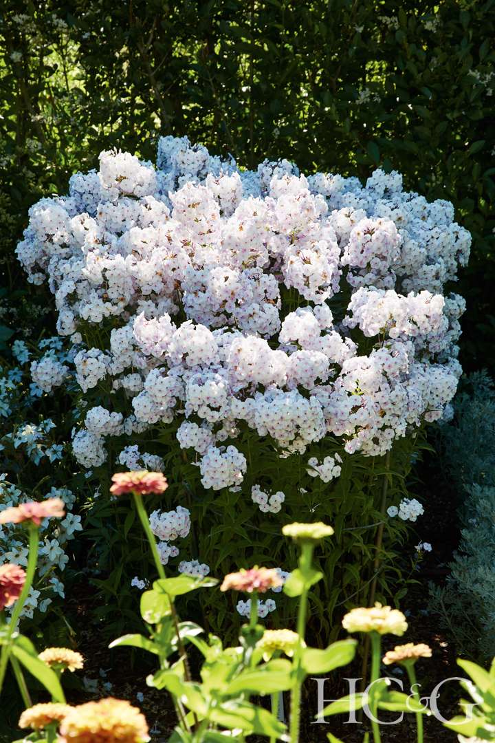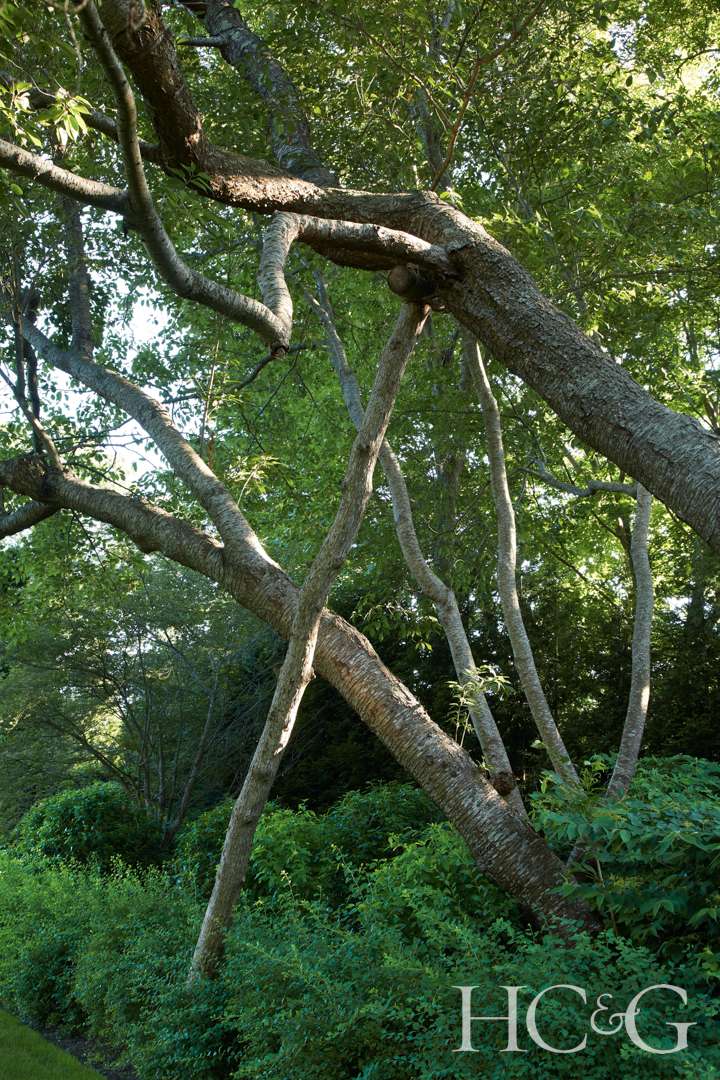 oaks define the south border of the garden, with limelight hydrangeas in the background.
