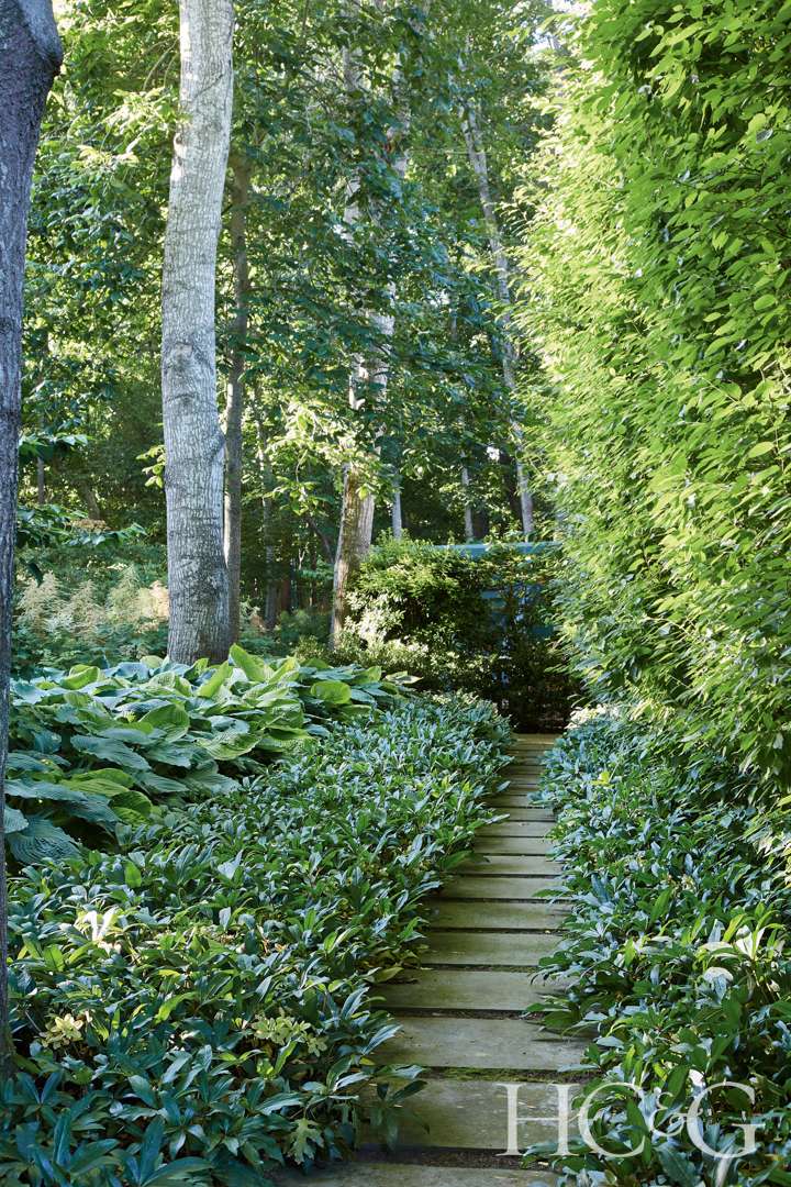 Hostas and other lush foliage appear throughout the garden, including near bluestone paths.