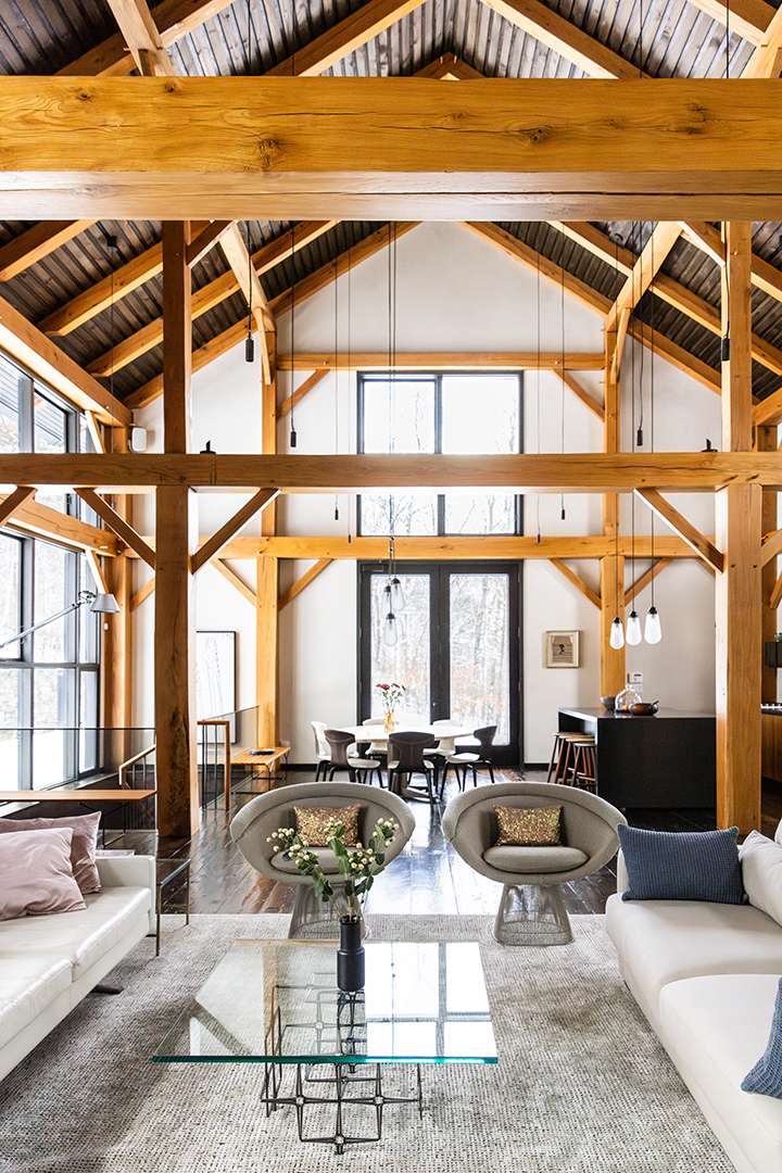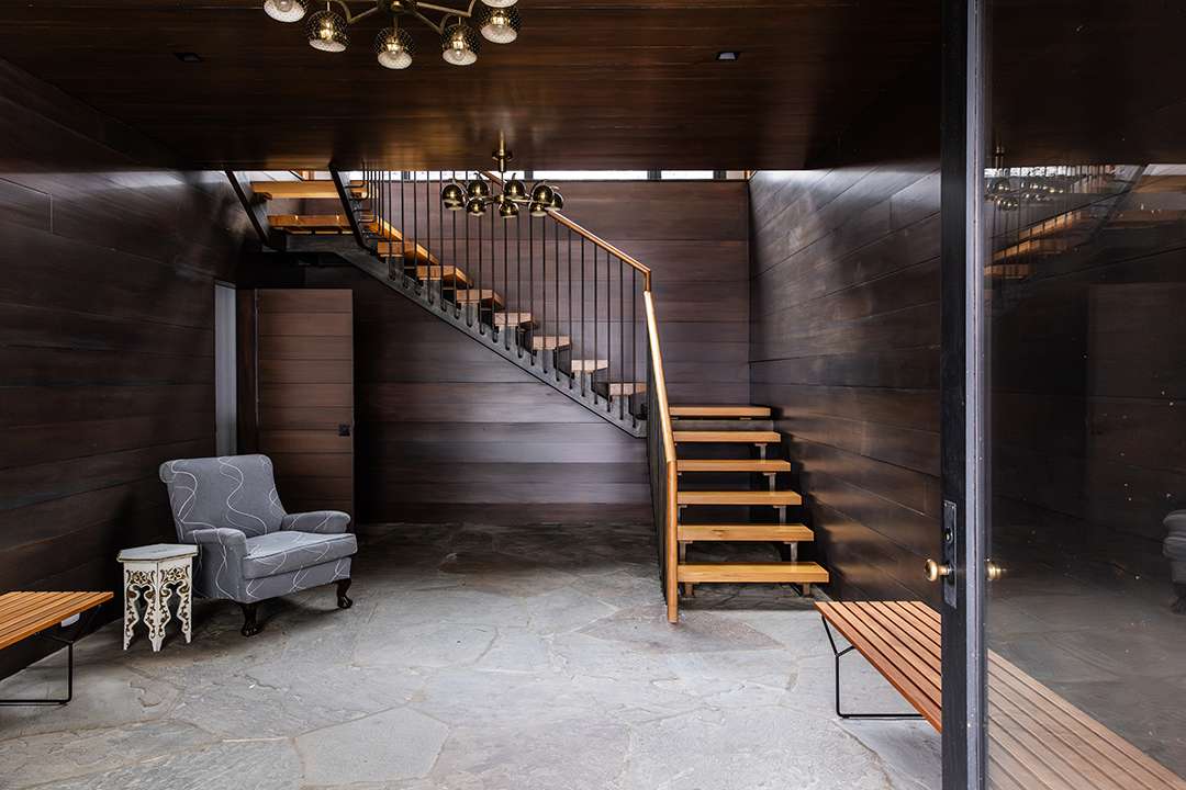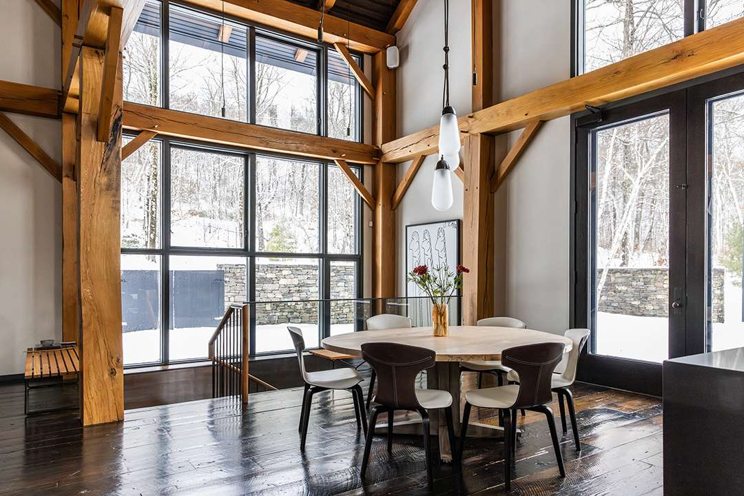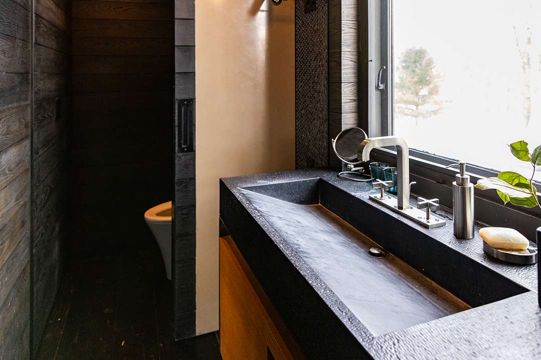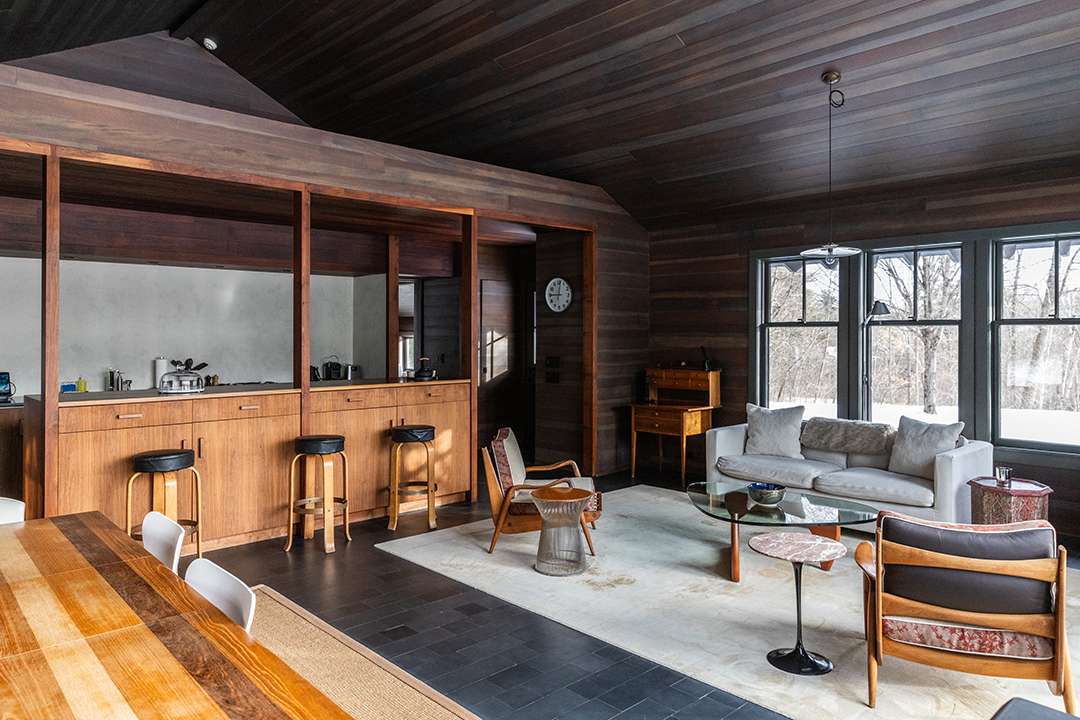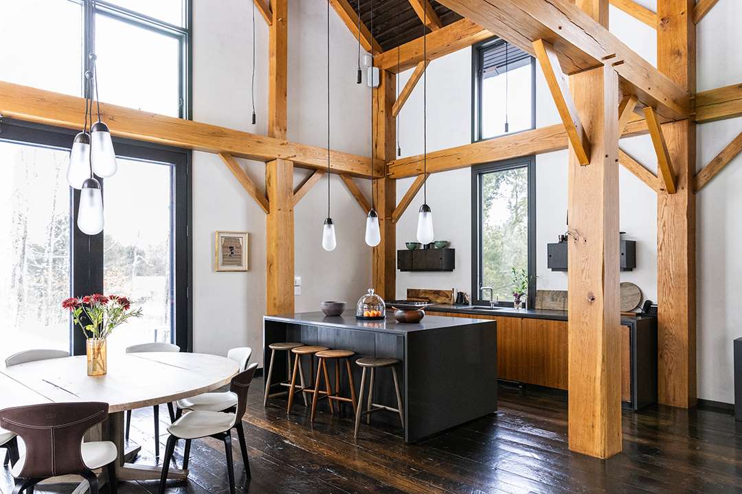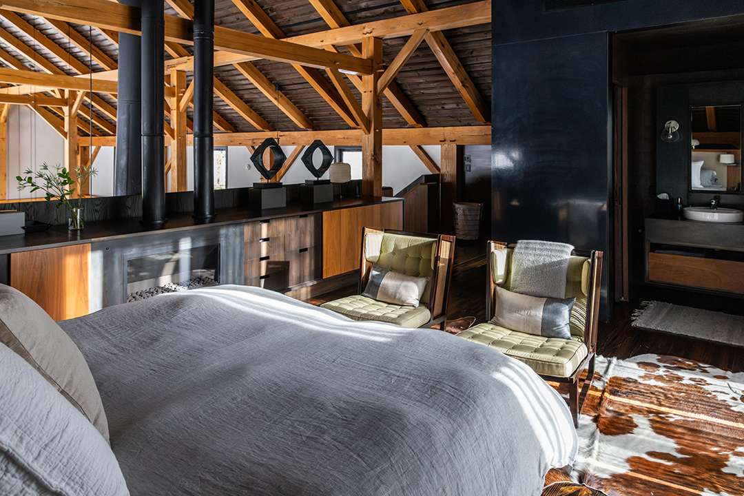 The spread is sleek and contemporary yet beautifully rustic across its nearly 85 acres. Across the property are three structures—the main house, designed to host all the gatherings, and two separate guest cottages that are perfect for overnight visitors. Wherever you are, a blend of airy and moody vibes abound. Different wood tones contrast a variety of black finishes, making the atmosphere feel modern yet almost spa-like.