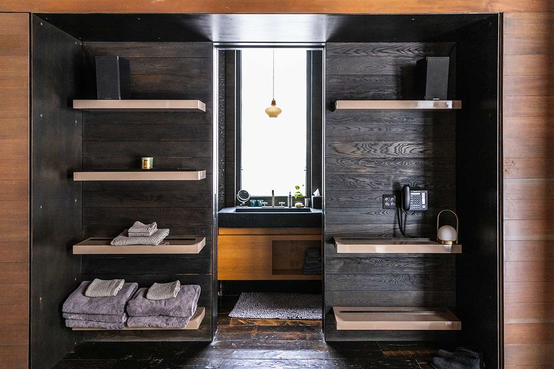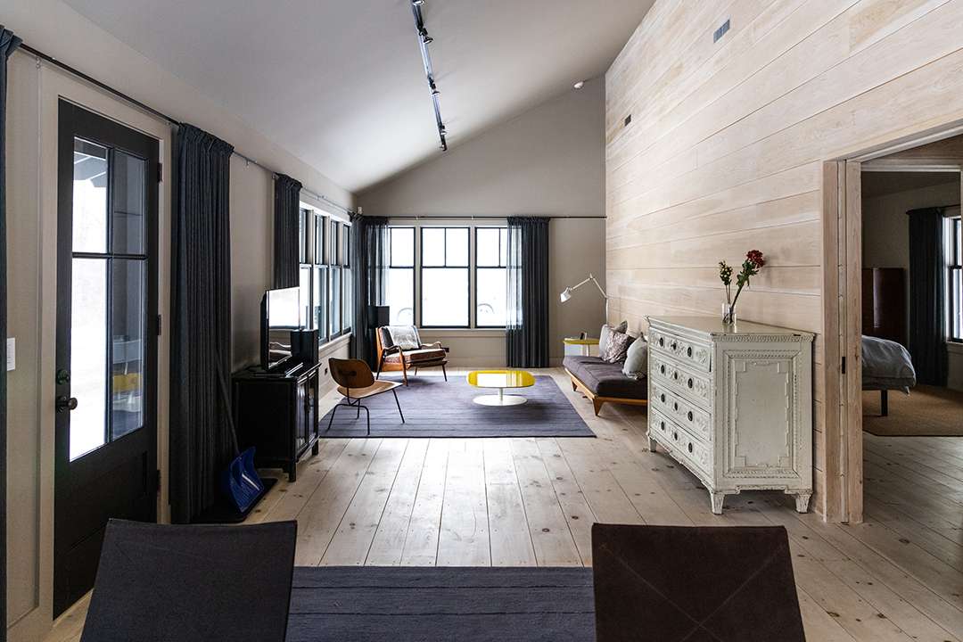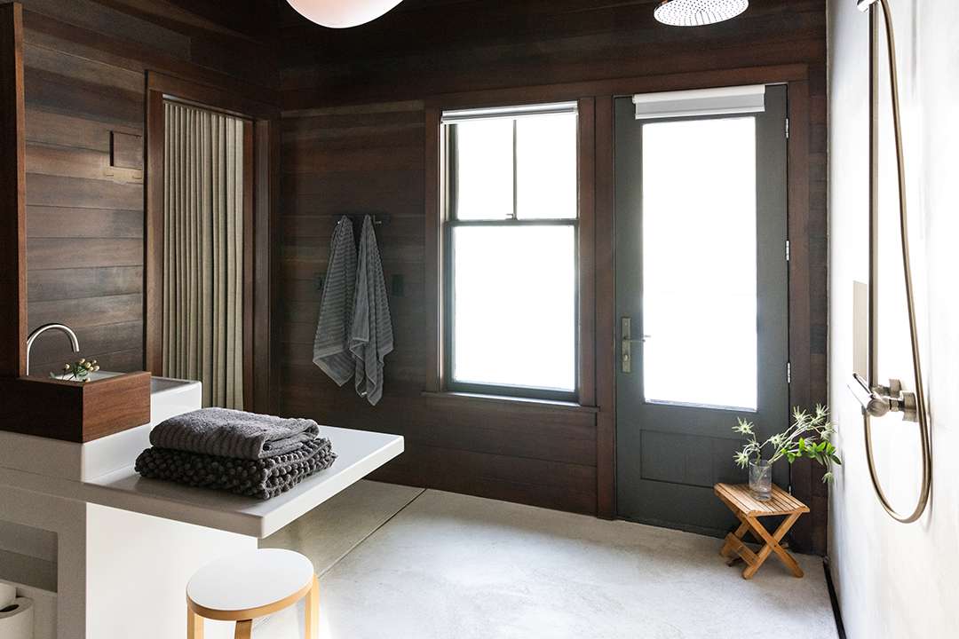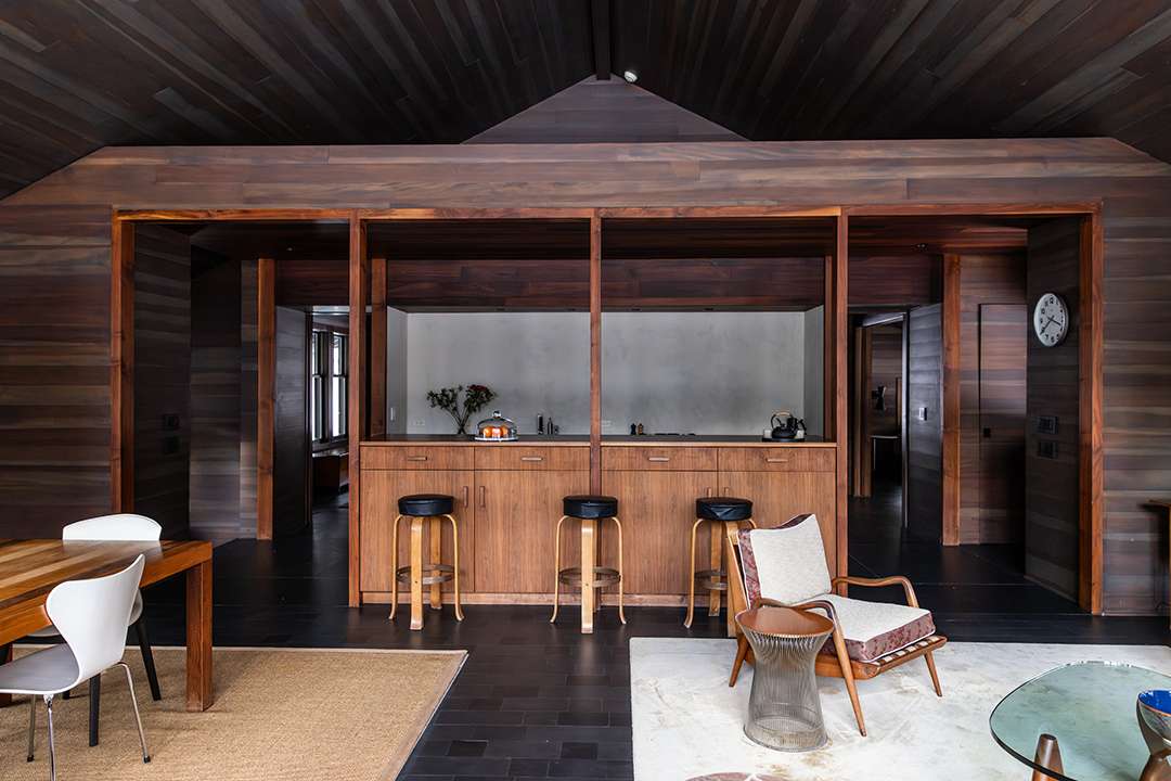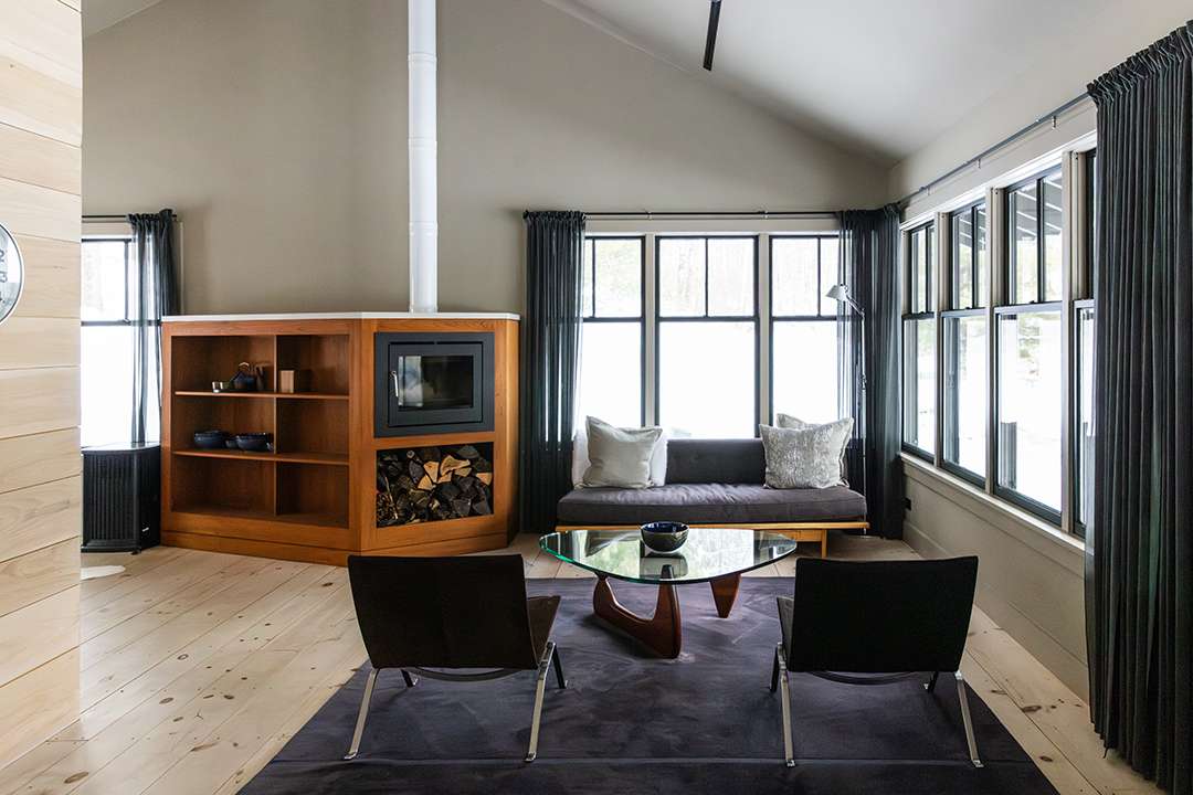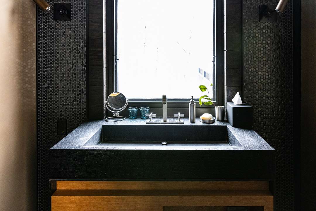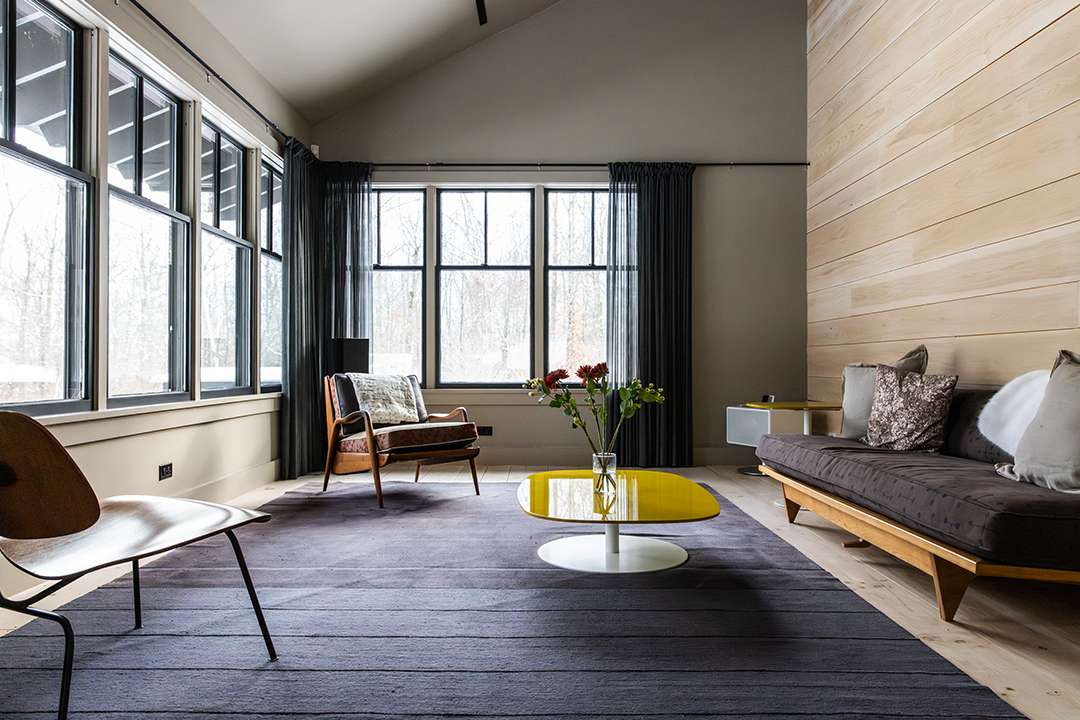 The spread is sleek and contemporary yet beautifully rustic across its nearly 85 acres. Across the property are three structures—the main house, designed to host all the gatherings, and two separate guest cottages that are perfect for overnight visitors. Wherever you are, a blend of airy and moody vibes abound. Different wood tones contrast a variety of black finishes, making the atmosphere feel modern yet almost spa-like.