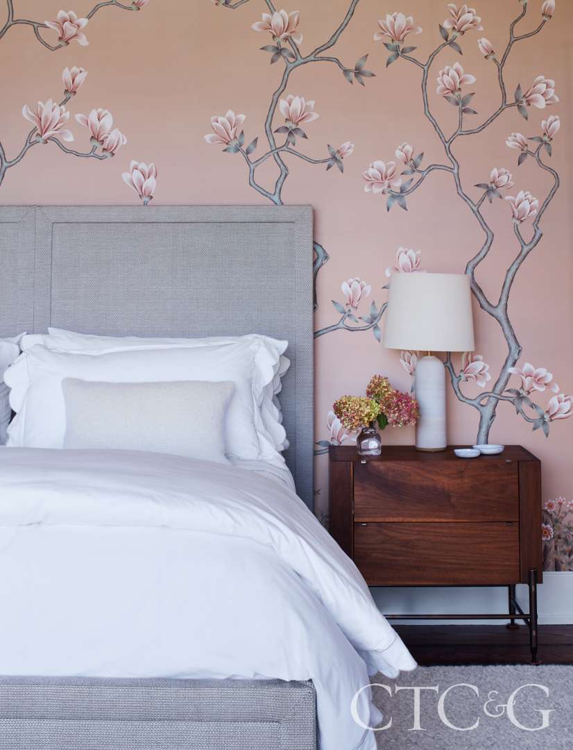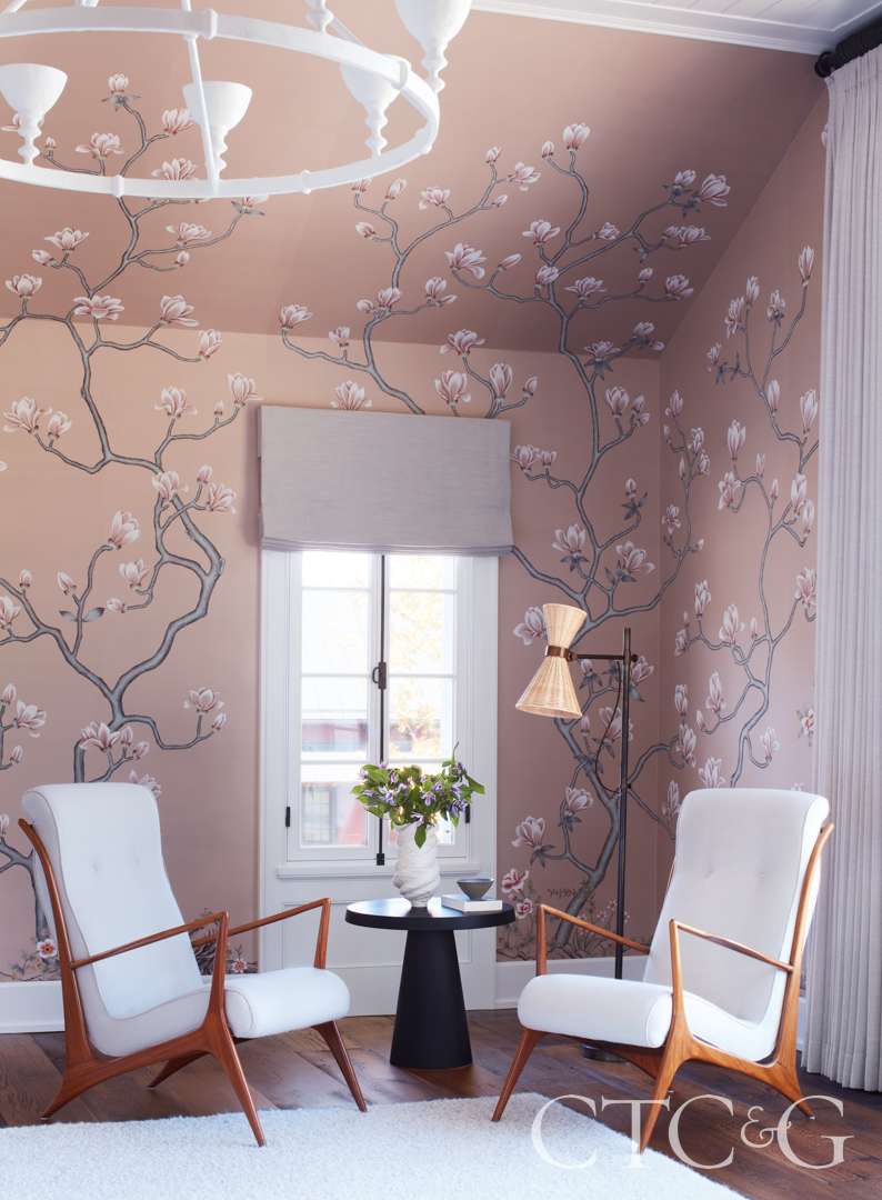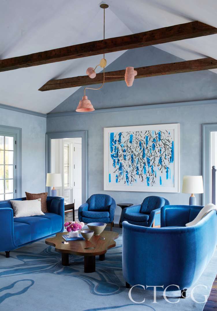 Deep hues flood the living room, where dramatic pale pink ceramic chandeliers hang above blue sofas and chairs, while the star of the room is a custom banquette set against a wall lined with shelving featuring a collection of ceramic vessels by various artists. Shades of green appear in the kitchen on the handmade millwork and a Lacanche range finished in a custom mint color. In the neighboring dining room, a colored-glass chandelier complements a barn painting by Michael Gregory. Blush wallpaper in the primary suite creates a relaxing atmosphere. Throughout the home, the colors harmoniously capture the homeowners’ vision.