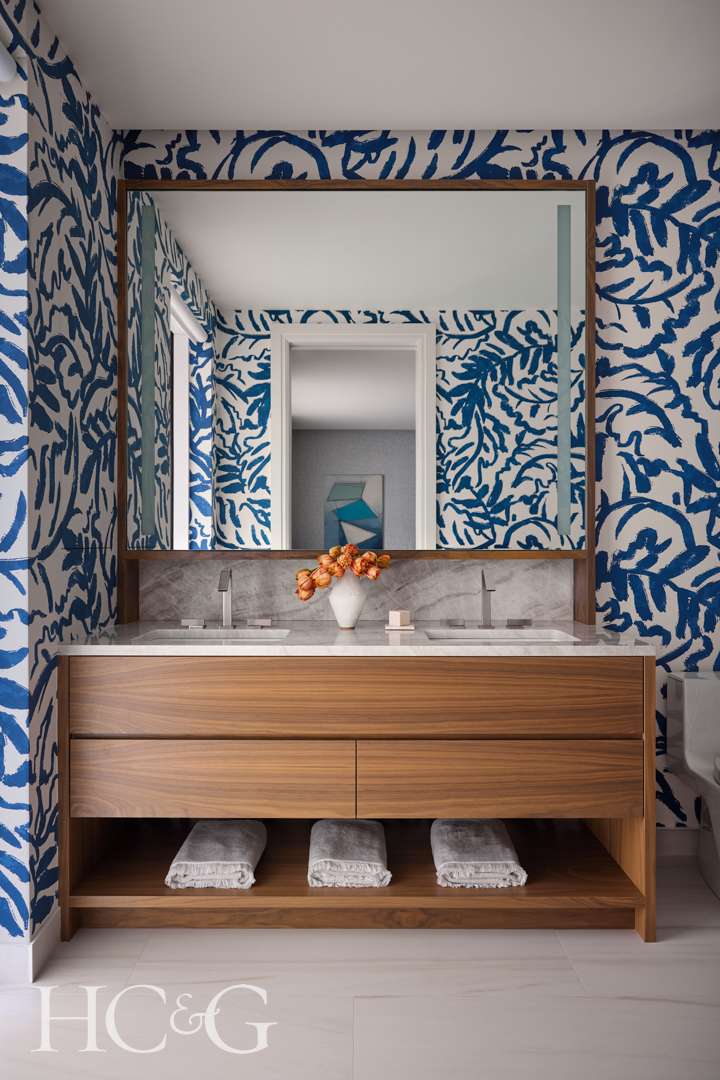 The entry itself makes quite the first impression, featuring a triple-height glass-and-cerused-oak staircase with a custom illuminated glass sculpture crafted by Czech company Lasvit. The original building’s upside down layout was maintained, with the majority of the bedrooms on the first level above the entry, and the main living areas as well as the primary suite on the top floor where the views are best. “We were restricted from expanding the home beyond its current footprint, so the layout remained more or less the same,” says Kikoski. “We did think about how a large family can live together while retaining some privacy. There are a variety of living spaces, from a den, lounge, and combination kitchenette and-dining area on the lower level to the library upstairs. Even when the house is full, everyone can comfortably coexist.”
