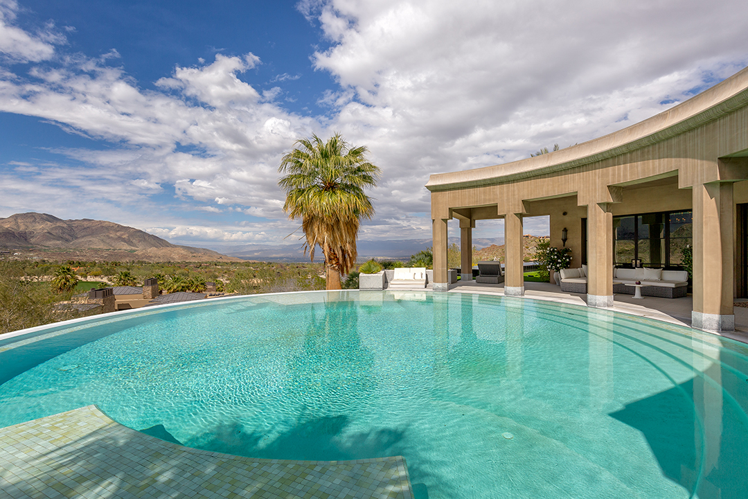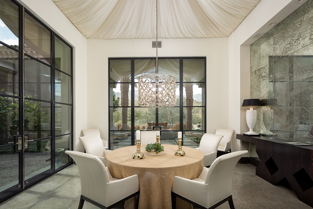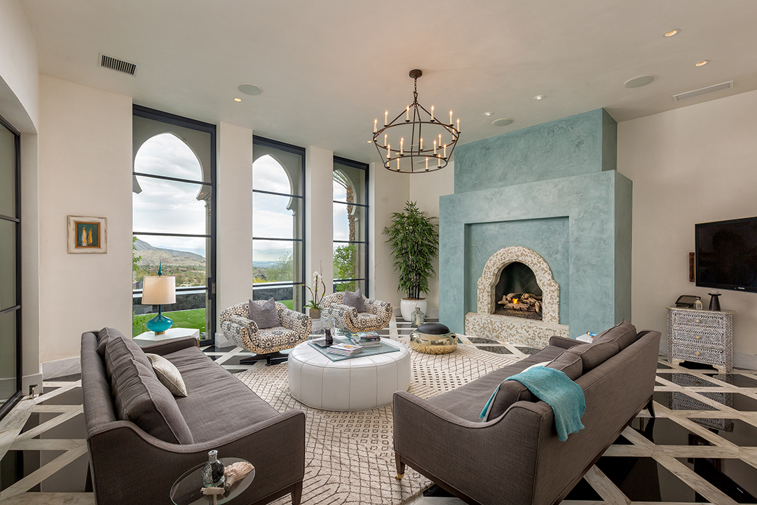 Throughout the dazzling abode, indoor and outdoor spaces blend into one another beautifully. An open garden and sitting area located in the center of the home will transport a new owner to the majesty of Morroco. Outside grand glass doors, pool time can be for workouts or recreation. A pristine 75-foot lap pool says all business, while a circular pool with mountain views, ample lounge space, and a huge outdoor kitchen exudes serenity.