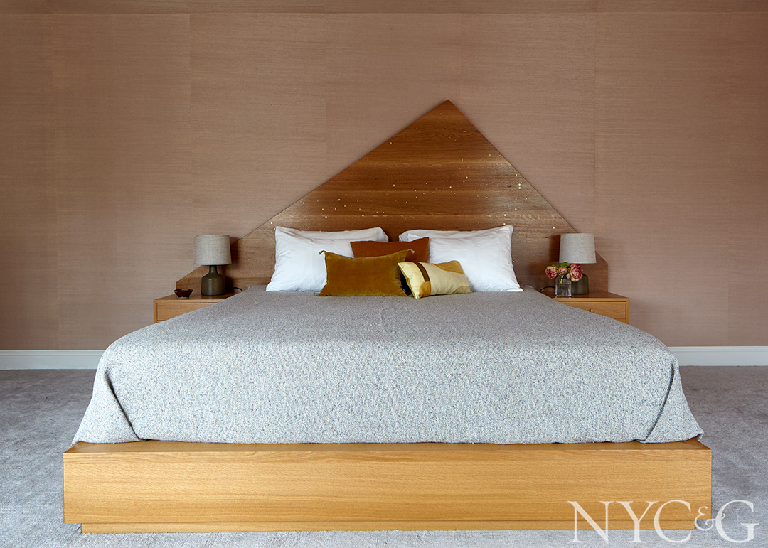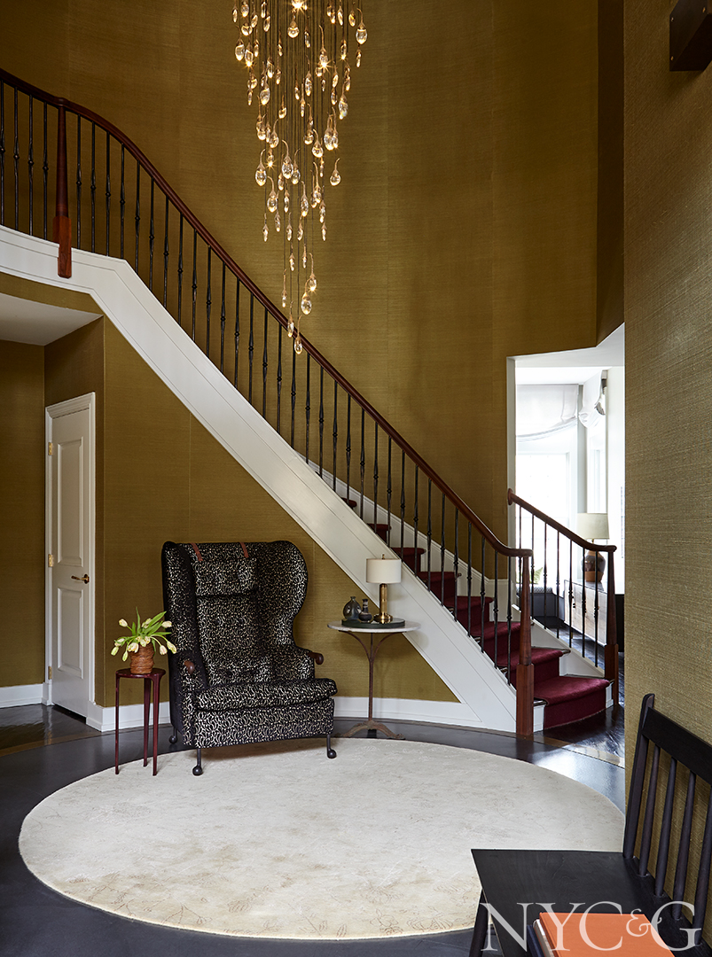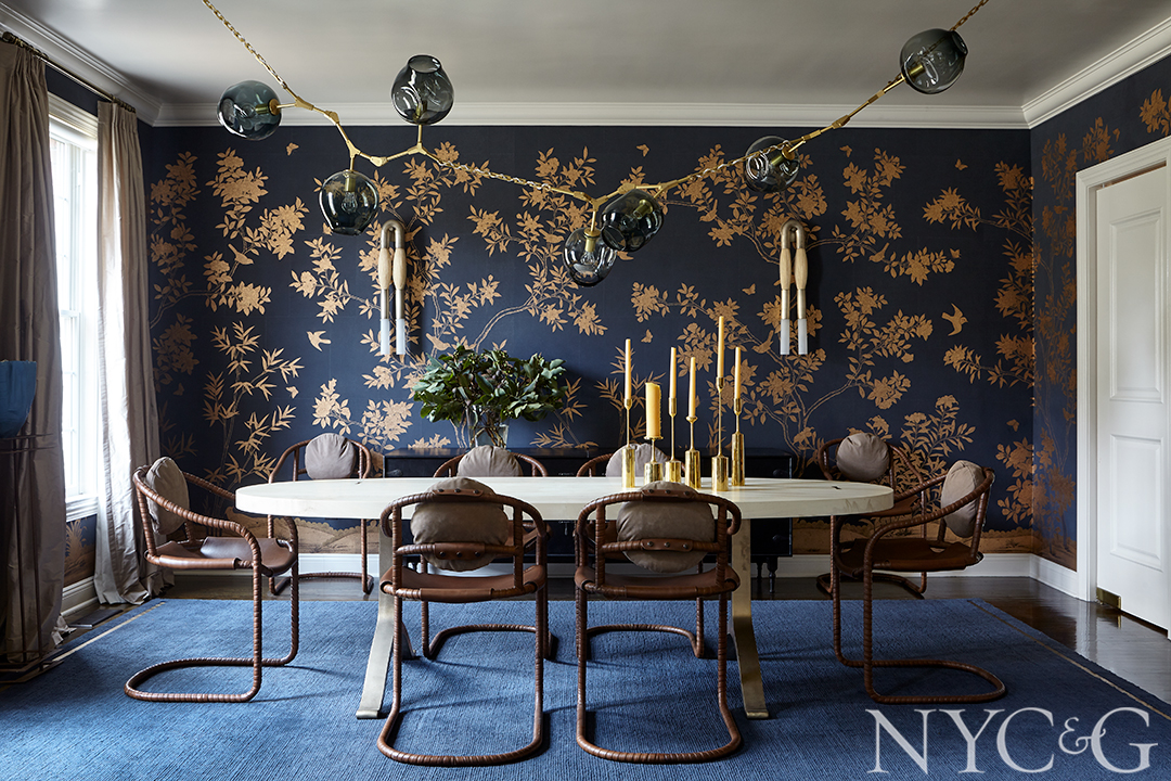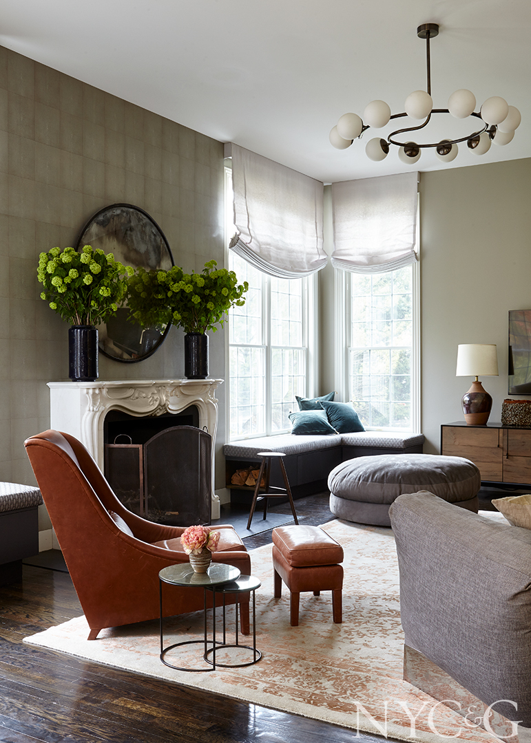 Customization is an important part of the Sleepy Hollow home’s DNA, from the millwork in a walk-in closet to a trifold brass mirror based on a French antique. “I had to go to three different metalworkers because it was such a challenging piece to make,” she says. (The back panels are covered in a custom dyed linen.) In the master bedroom, she took her lead from a photo of the famed Hollywood sign (the owners are originally from California), which established the “serene” color palette upstairs. In the dining room, a “driftwood-y” chandelier “adds a little whimsy to the more serious wallpaper.” The wet bar, with its butterscotch onyx and linen-fold wood, was a present from the wife to her husband, a cocktail aficionado who makes his own bitters. “It’s all in the details,” Tallisman reflects, “and it has to be special. I want clients to walk into a space and see that it’s what they dreamed of.”