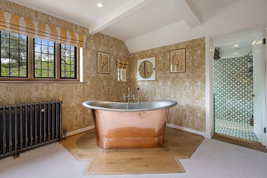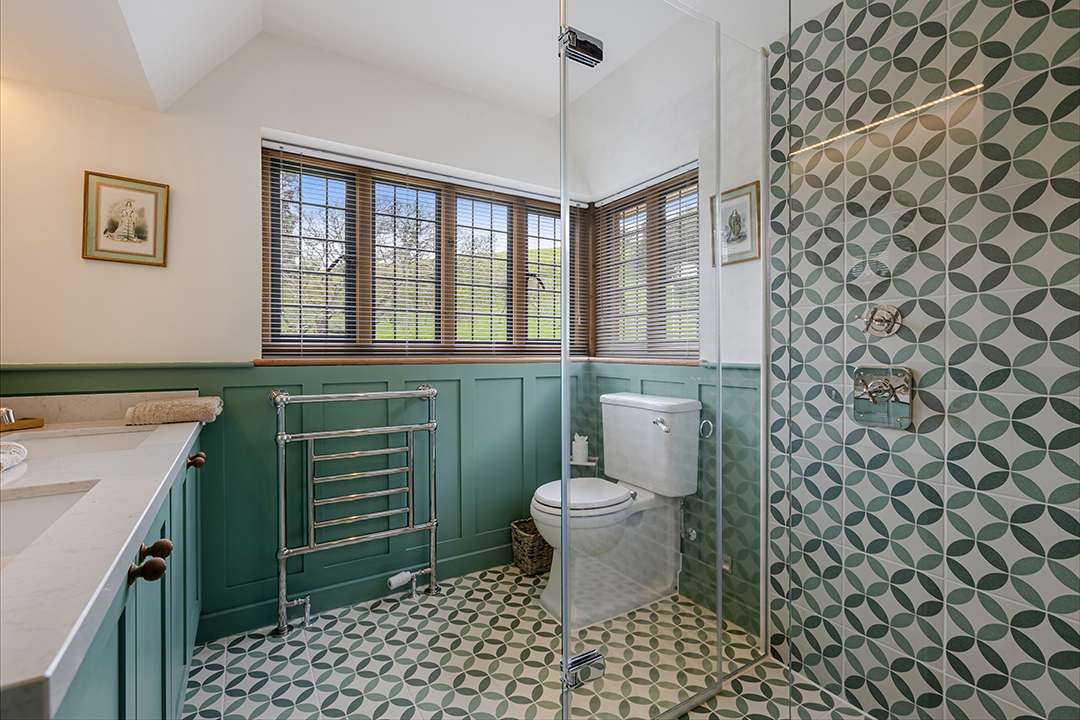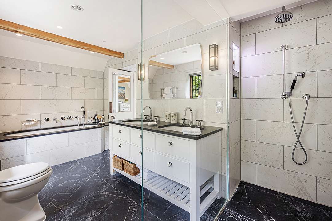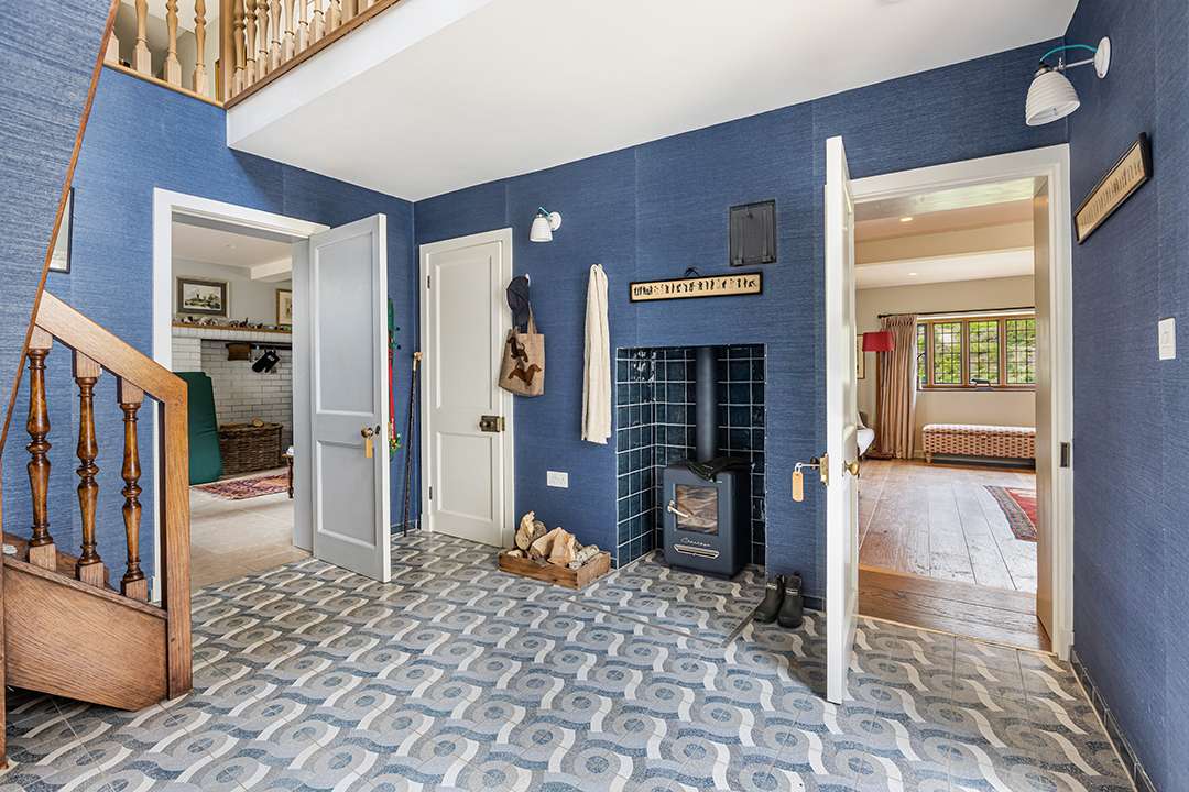 Today, the picturesque spread includes a main house, boat house, and pool house—all brimming with classic English flair. Part of that includes rich wood details, elegant patterns, and rooms that each have their own delightful personality and color story. However, contemporary touches also find a place seamlessly. The kitchen is updated and outfitted in a light blue hue, and the bathrooms reflect modern sensibilities with their luxurious, glassy showers. In total, there are 10 bedrooms and nine bathrooms to enjoy.