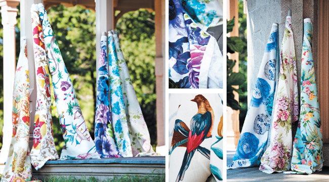 Color story (above, top) Detail of Designers Guild’s Oriana in Crocus, #F1957/01, from the Pavonia collection. Birds of a feather (above, bottom) Detail of Pierre Frey’s Chinon in Original, #F289001. In Full Bloom (left, on the porch) Robert Allen’s Elizas Garden in Marigold, from the Williamsburg Classics II collection. Calico’s Silsila in Curry, #000296632. Pierre Frey’s Chinon in Original, #F289001. Designers Guild’s Oriana in Crocus, #F1957/01, from the Pavonia collection. Romo’s Fleur in Lagoon, #7526/06, from the Tulipa collection. Sanderson’s Lilacs in Pink/Stone, #DMAY221957, from the Maycott Prints collection. Petal Pusher (right) Villa Romo’s Kabuki in Cornflower, #V3038/04, from the Kabuki collection. Alhambra’s #1055-02. Scalamandré’s Bird Song, from the Arcadia collection.