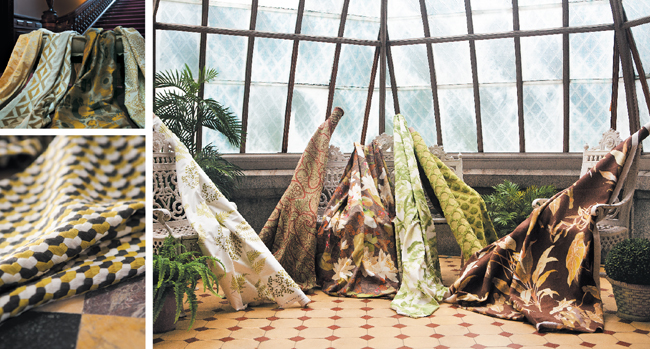 Grand Entrance (top left, on the side entrance) Villa Romo’s Mokoshi in Eden, #V3039/03, from the Kabuki collection. Designers Guild’s Abruzzo, #F1948-03, from the Torgiano Collection. Haute Heirloom (top right) Pierre Frey’s Beauvais-Broderie in Rose Lilas, #B7572001. Olive You (bottom right) Nina Campbell’s Boxgrove in Lime/Olive, #NCF4080-06, from the Woodsford collection. Chocolate Fix (bottom left) Anichini’s Pema in Multi.