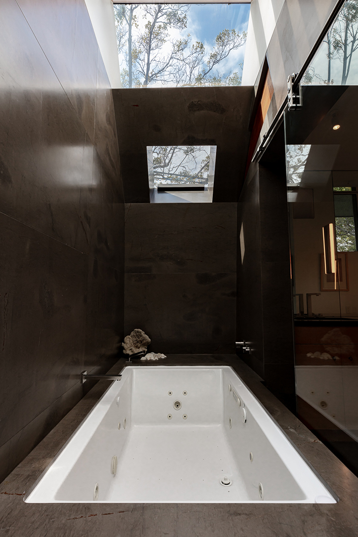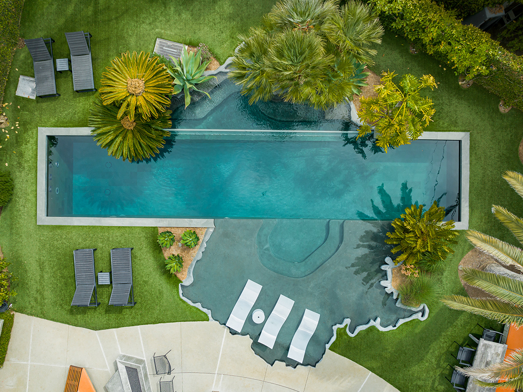Rounding out the private living spaces are four bedrooms and five full bathrooms, leaving ample space for those who want to experience Constellation 167 firsthand. As part of the renovation, the owner tapped Moss to design a cool, lap pool-lagoon combo. It’s easy to feel transported to a place far away when sitting by the water amidst the expanse of lush greenery.