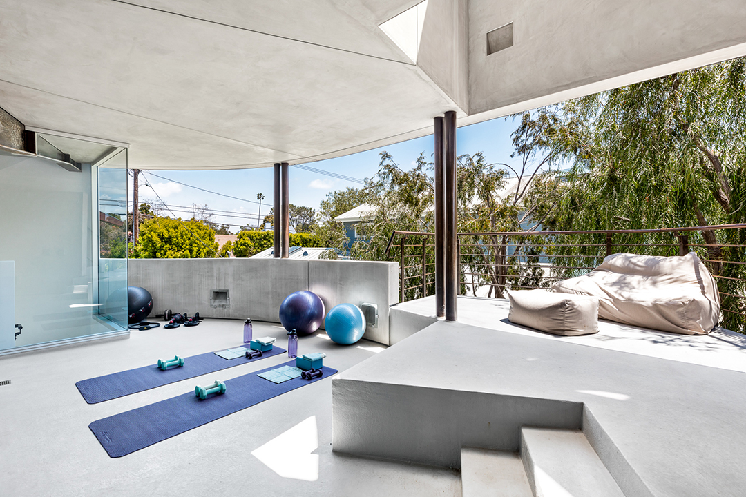 The concrete home feels edgy and futuristic, although it was built in 1991. From the outside, the most eye-catching part of the home is its circular dome—inside, that space has many showpiece moments including a stunning spiral staircase to traverse through the levels.