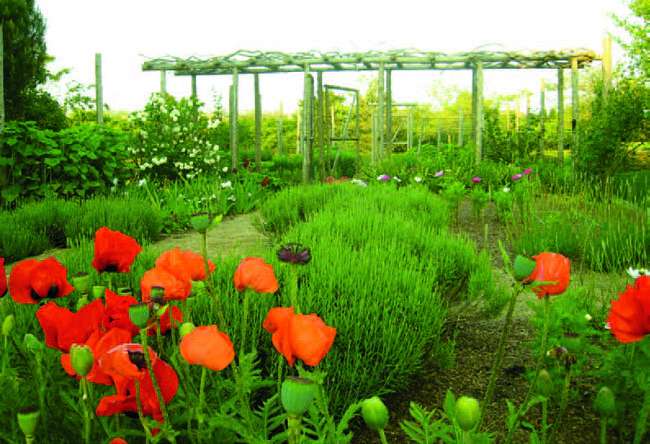 Pretty Pergola | A pergola made of cedar and mountain laurel stands behind a cutting garden.