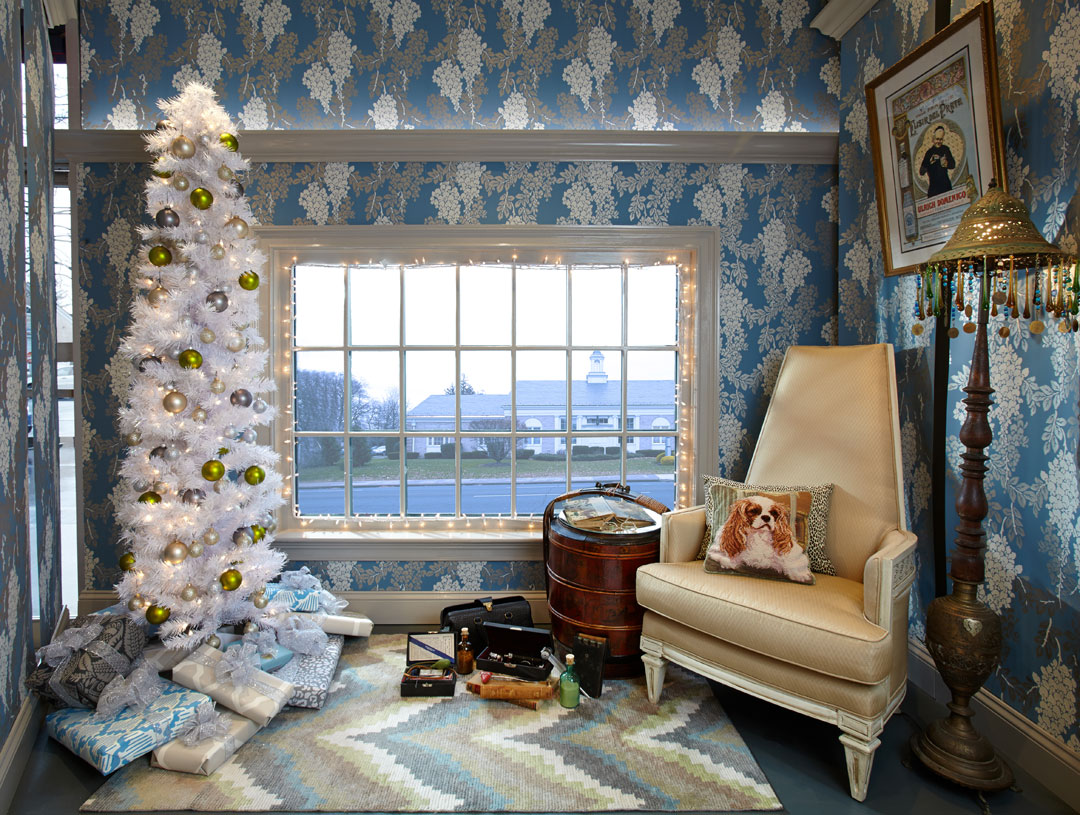 “When I was given the opportunity to create a window vignette for Farrow & Ball for DIFFA I thought about all the wonderful people in the world working so hard to find a cure for those suffering with AIDS. My goal was to create a display that would honor the medical professionals offering both comfort and cure to those in need while highlighting the beautiful products produced by Farrow & Ball. I was able to find an antique doctors bag that was filled with all sorts of vintage medical tools and apparatus from 1948. My space is presented as the personal office of a doctor who travels the world helping those with AIDS. She is home for the holidays but still focused on her critical research.”