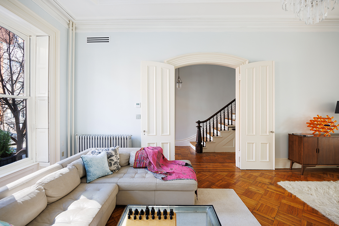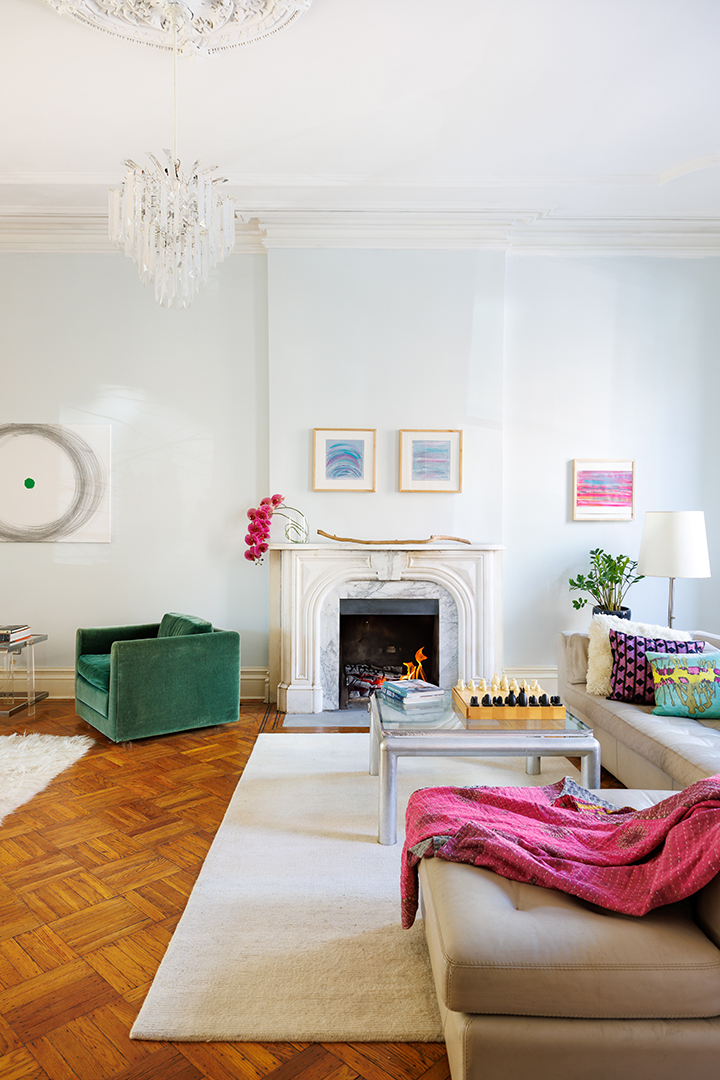 It’s no surprise that a designer of Kerrigan’s caliber would have a well-tailored NYC pad. Pops of color add whimsy to the 19th century home, which is full of high ceilings, lovely period details, and charming doorways. Spanning across five floors with 4,500 square feet of interior space, original features like wood-burning fireplaces and parquet flooring ensure a sense of history and a sense of place. Artfully designed with easy living in mind, the primary living spaces flow seamlessly into one another.