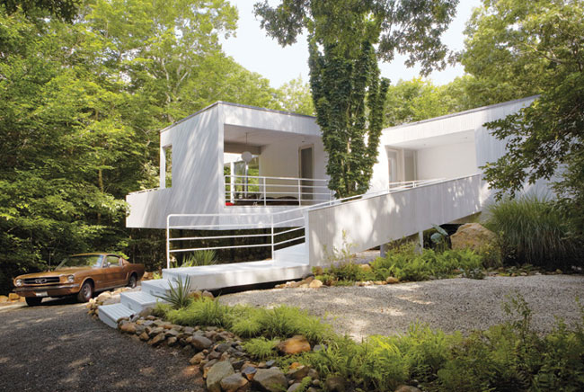 A STRIKINGLY MODERN HOUSE IN THE Amagansett woods was not what Kathy and Scott Formby had in mind when they started searching for a weekend place in the early 1990s. “We soon found that the typical shingled Hamptons farmhouse has small windows and chopped-up rooms, and we thought, maybe we should look at something more modern,” Kathy Formby recalls. Then they saw “this amazing structure, like a tree house in the woods”—and were sold. Theirs isn’t just any modern house. It is one of 35 innovative homes, many on the East End, designed by Julian and Barbara Neski, the distinguished architectural team behind the famous fin-shaped 1964 Chalif house in East Hampton and the white-cube 1968 Cates house in Amagansett. The Formbys’ home is a fine example of, as the New York Times put it in Julian Neski’s 2004 obituary, “functionalist simplicity combined with sculpturally expressive form.”