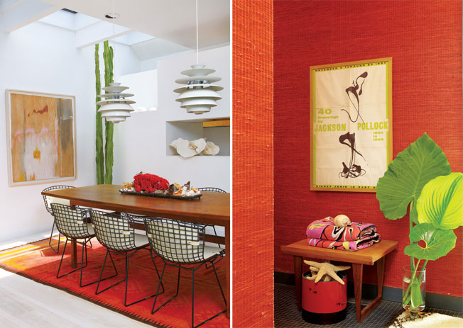 The decor, which has evolved gradually over the years, is an unforced mix of pedigreed mid-20th-century furnishings and colorful Moroccan textiles. Vintage Knoll sofas, low-slung Danish modern pieces and a handsome Jens Risom dining table are the mainstays. A variety of rugs, poufs and cushions on the floors and sea-grass wall coverings add character. “We weren’t going for any style in particular,” Kathy says. “We acquired things over the years and chose what seemed to fit the sensibility of the house.”